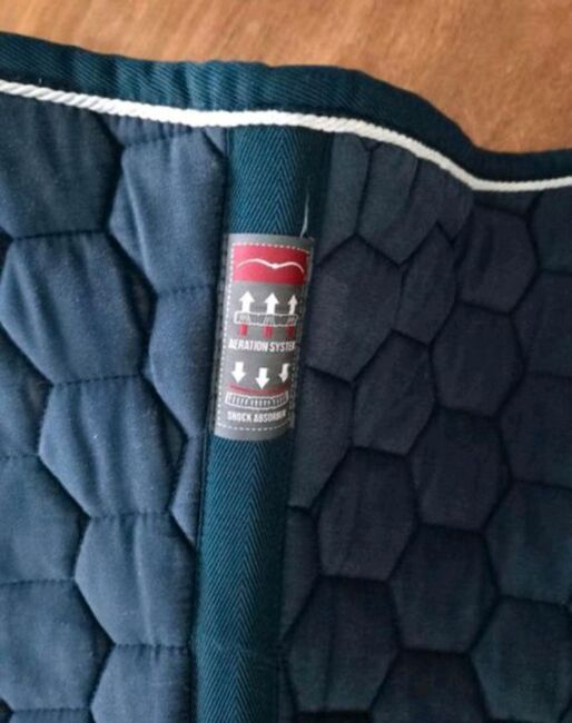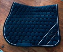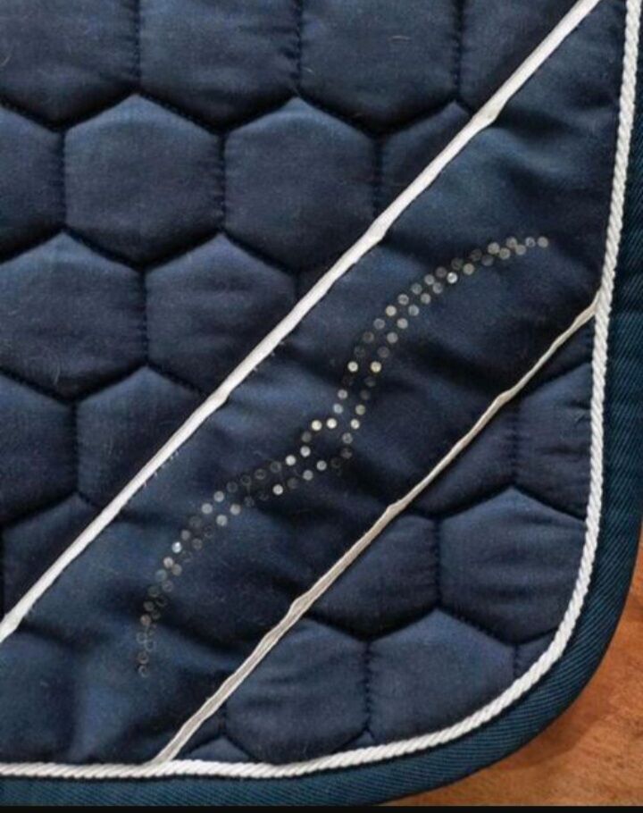 ⭐️Animo⭐️Schabracke VS w rozmiarze WB - Podkładka pod siodło VS WB by Animo w kolorze granatowym z białym sznurkiem. Logo w błyszczących kamieniach, z których część niestety już zaginęła zgodnie ze zdjęciami.