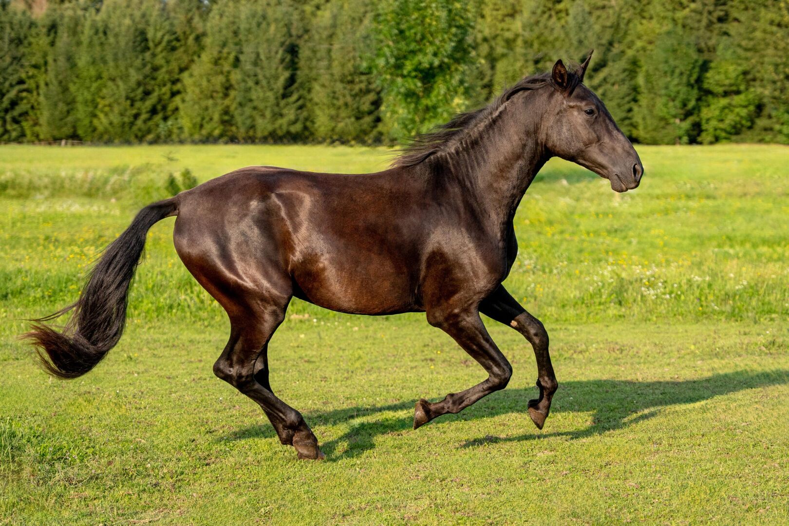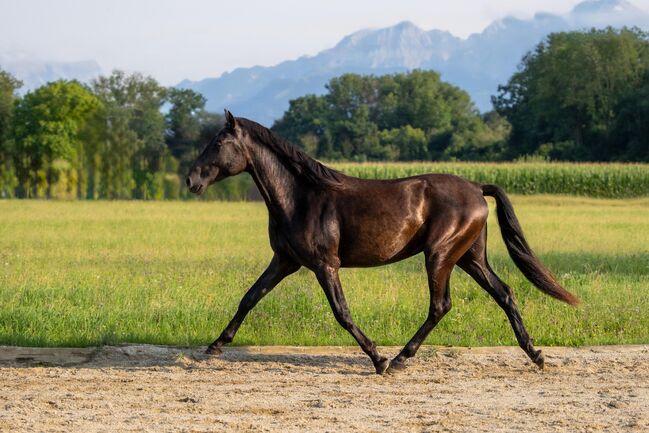 ...to imponujący czarny wałach Pura Raza Española, który jest dobrze rozwinięty jak na swój wiek. Obecnie mierzy 1,63 metra. Stoi w eleganckim, długonogim typie ujeżdżeniowym, z dobrą podstawą i doskonałą górną linią, imponuje wybitnymi ruchami. Jego talent skokowy był imponujący już w młodości.