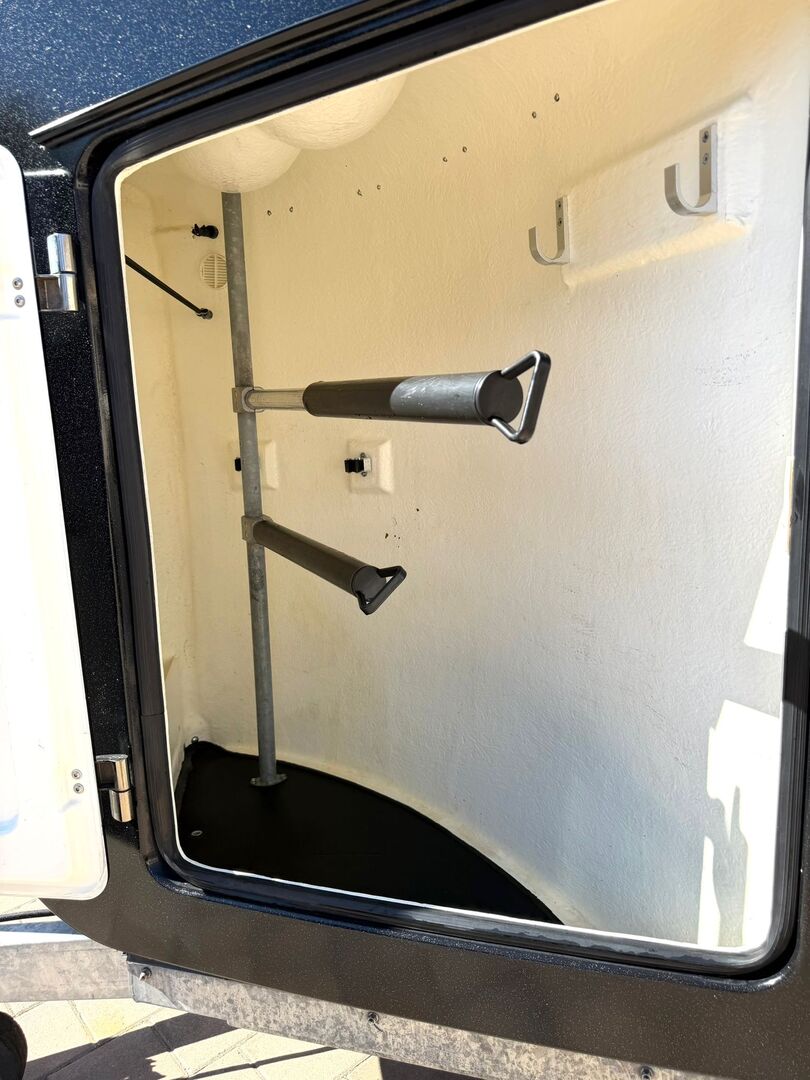 - Pomieszczenie na siodło z wysuwanymi uchwytami na siodło i oświetleniem wewnętrznym oraz łopatą i miotłą