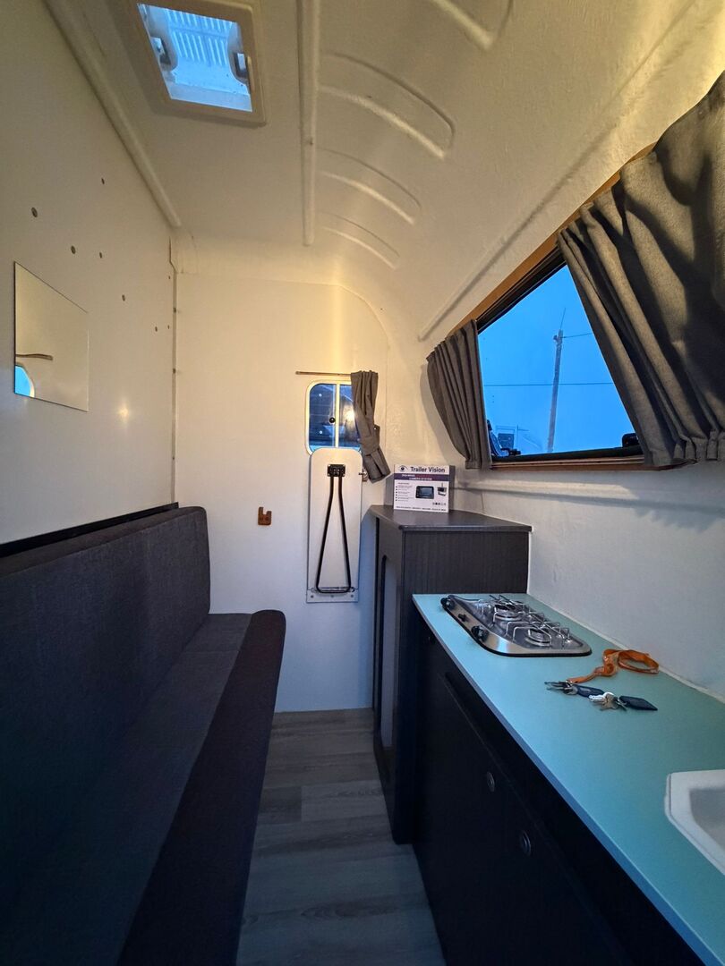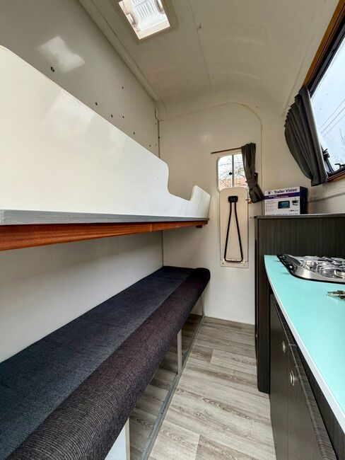 - Oddzielne przyłącze gazu, obok drzwi wejściowych do części mieszkalnej - Łóżka piętrowe z możliwością przekształcenia w zestaw wypoczynkowy - Luk dachowy z moskitierą w części mieszkalnej - Składany stolik - Kilka schowków - Kuchenka gazowa - Przesuwne okna boczne - Przednie okno na zawiasach - zlew - Zbiornik na wodę - Nowy akumulator - Zamykane drzwi
