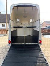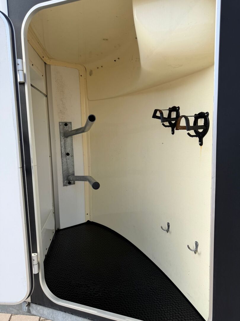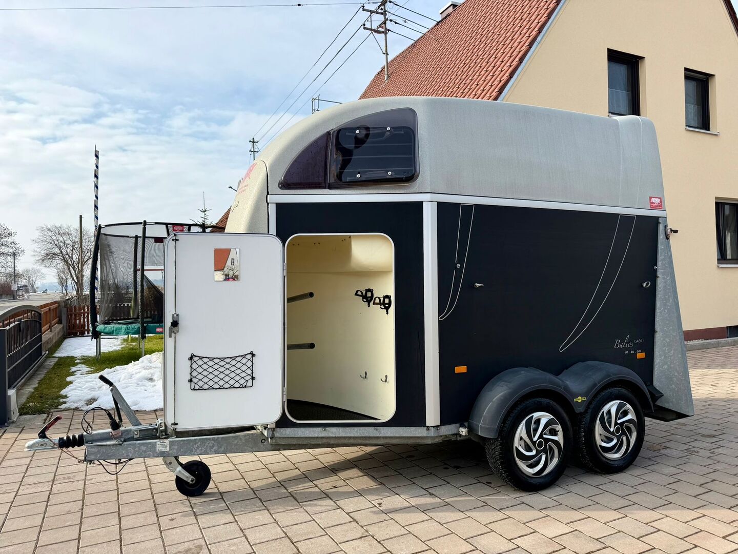 ❗️Humbaur Balios Aero Saka przyczepa do przewozu koni Przyczepa do przewozu koni - - Pierwsza rejestracja 07/2013 - Masa własna 804 kg - Masa całkowita pojazdu 2400 kg - Maks. obciążenie dyszla 100 kg - HU do sierpnia 2027 r. - Podwozie z amortyzatorami do homologacji 100 km/h - Opony od 2023 r. - Automatyczne koło kopiujące - Otwierane przyciemniane szyby - System antynapadowy - Pomoc przy załadunku - Roleta z siatką - Ogranicznik boczny na rampie załadunkowej - Drewniana podłoga - Gumowa podłoga przyklejona i uszczelniona - Uchwyt na siatkę na siano - Oświetlenie wewnętrzne - Kamera z monitorem - Uchwyty na wiadra z paszą i wodą - Całkowicie zdejmowana ścianka działowa z PVC z regulowanym drążkiem obrotowym - Poziomowanie dla kucy - Ochrona stopni - Wyściełane pręty piersiowe i tylne - Siodlarnia