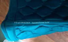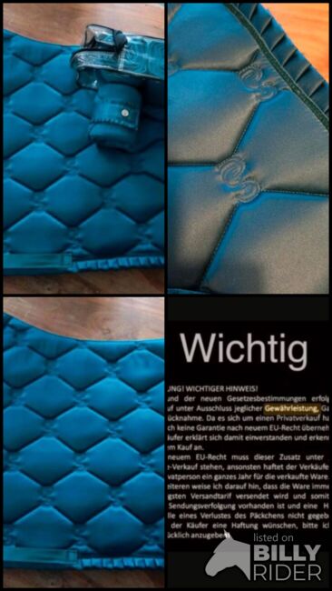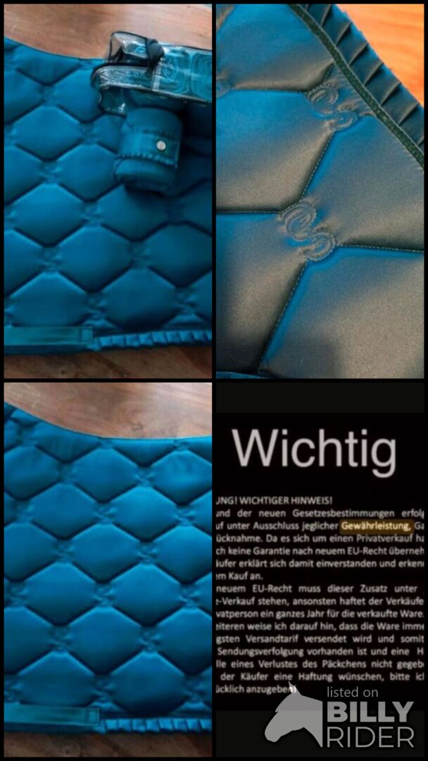 ⭐️PS z Sweden⭐️Set Podkładka pod siodło ujeżdżeniowe + bandaże w rozmiarze WB - Zestaw składający się z podkładki pod siodło ujeżdżeniowe WB i zestawu 4 bandaży polarowych WB, marki PS of Sweden, model/seria Ruffle. Kolor: Petrol Blue. Łączna cena wyniosła 150 €.