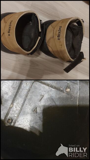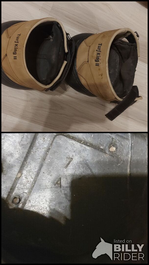 1 para butów do kopyt Turf King II w rozmiarze 7 - Cena za oba. Kupiłem je (lekko) używane i są w doskonałym stanie. Pasowałyby na mojego Norikera z kopytami o szerokości 15 cm, ale pasek zapinający jest za krótki ze względu na jego wyraźniejsze ochraniacze.
