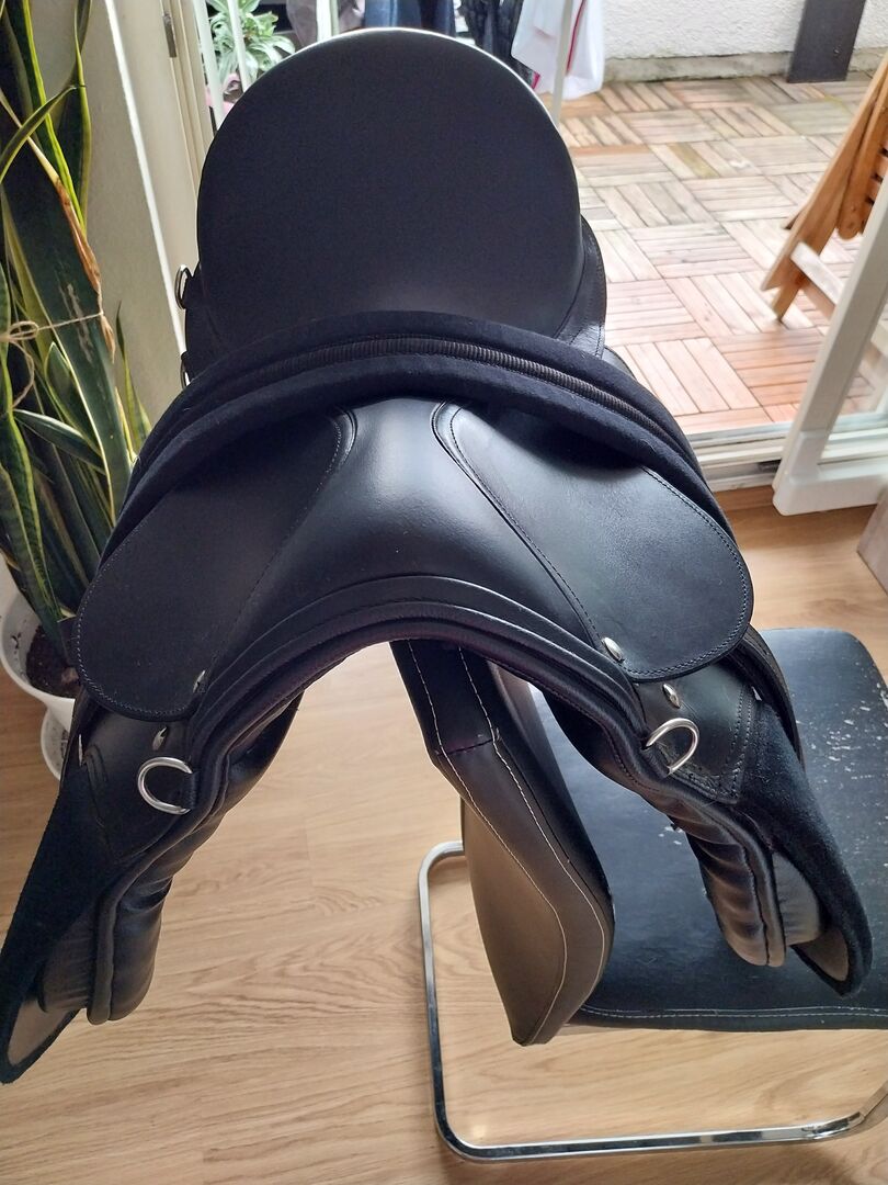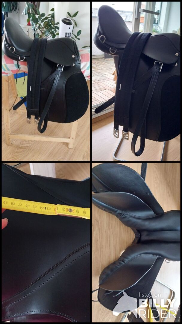 16,5-calowe siodełko w idealnym stanie wraz z akcesoriami. - Oferuję siodło w idealnym stanie (jeździłem tylko raz), które nie pasuje i dlatego wisi. Ma małe ślady pod skórą lewego strzemienia (patrz zdjęcie).