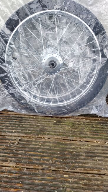A pair of brand new , wire spoked, 16" cart wheels. Pneumatic tyres. Sizes in photo.