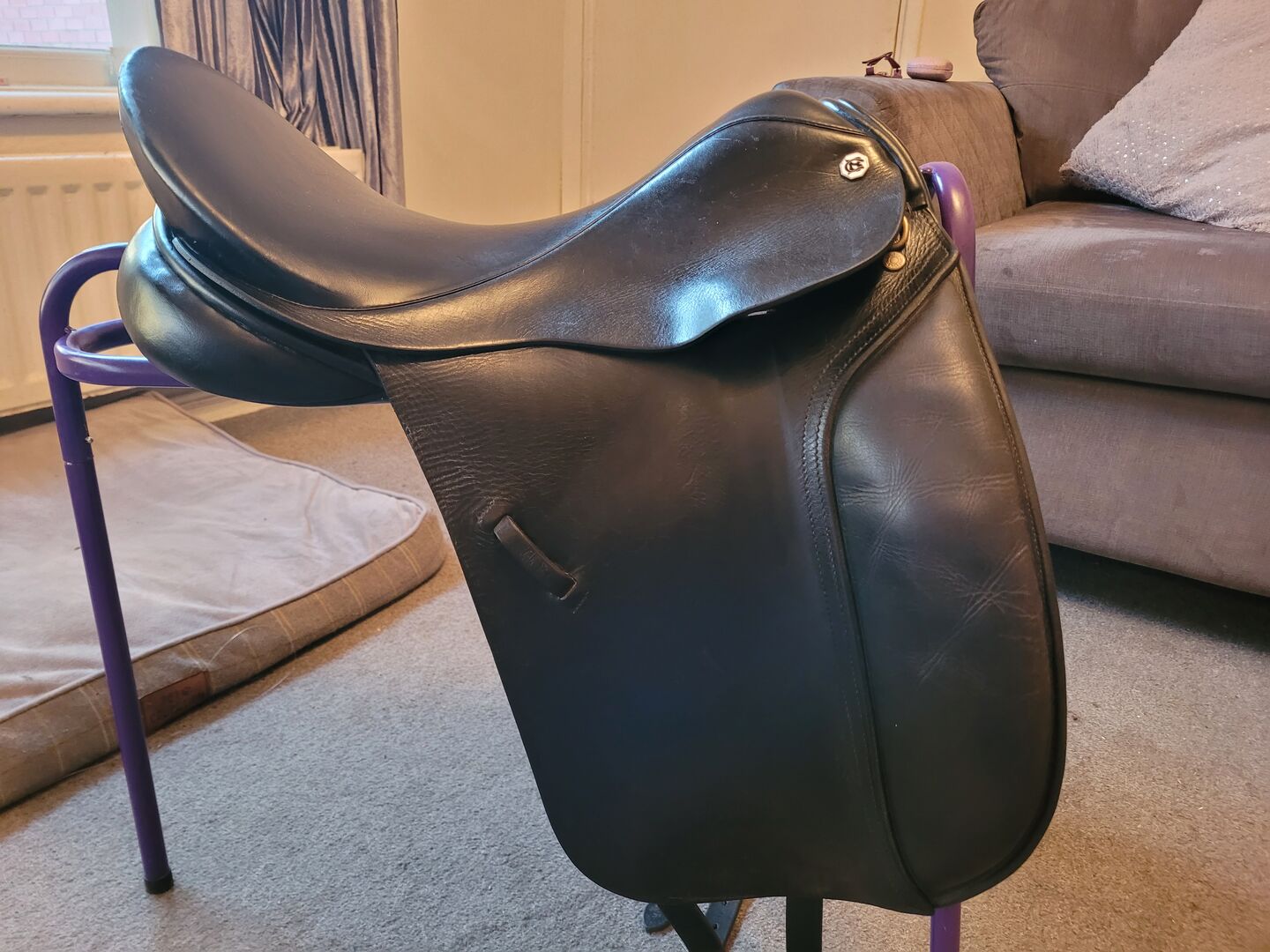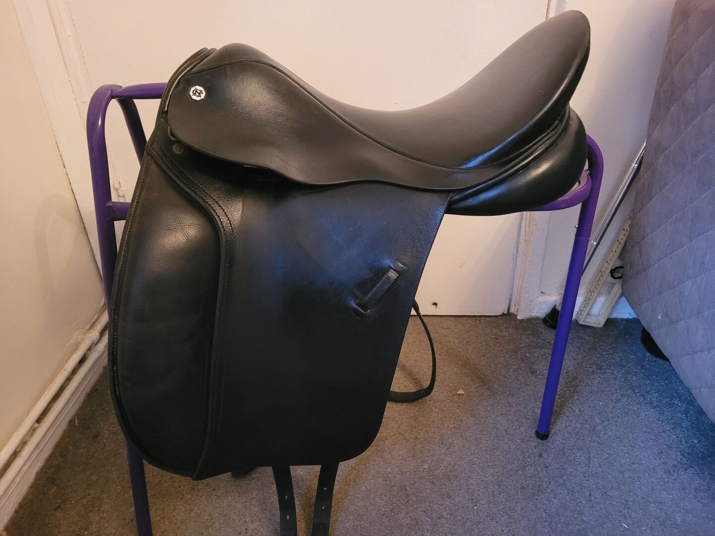 17.5" Barnsby Black leather dressage saddle. Very comfy. Generous knee rolls.D ring to D ring is 7.5". Very good condition despite been used. Slight scuff mark on back of seat. Any questions welcomed. No returns If doesn't fit, happy to send more pictures or answer any questions.