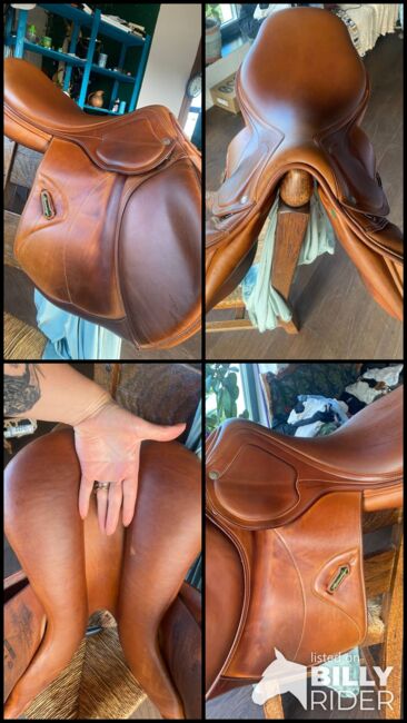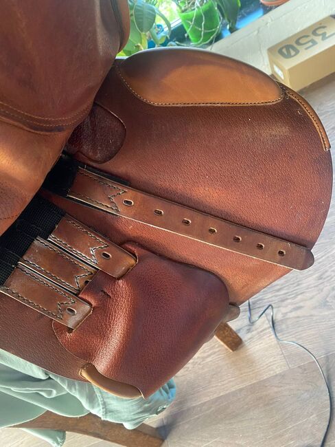 Mit seinem nach vorn geschnittenen Sattelblatt und den unterstützenden Kniepauschen ermöglicht er eine optimale Position und Stabilität über Sprüngen, bleibt aber auch auf der Ebene äußerst bequem. Das Leder ist weich und gepflegt und weist nur leichte, altersübliche Gebrauchsspuren auf.