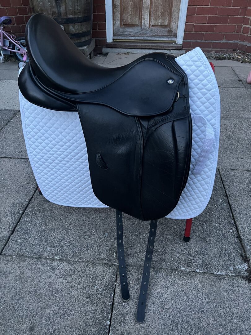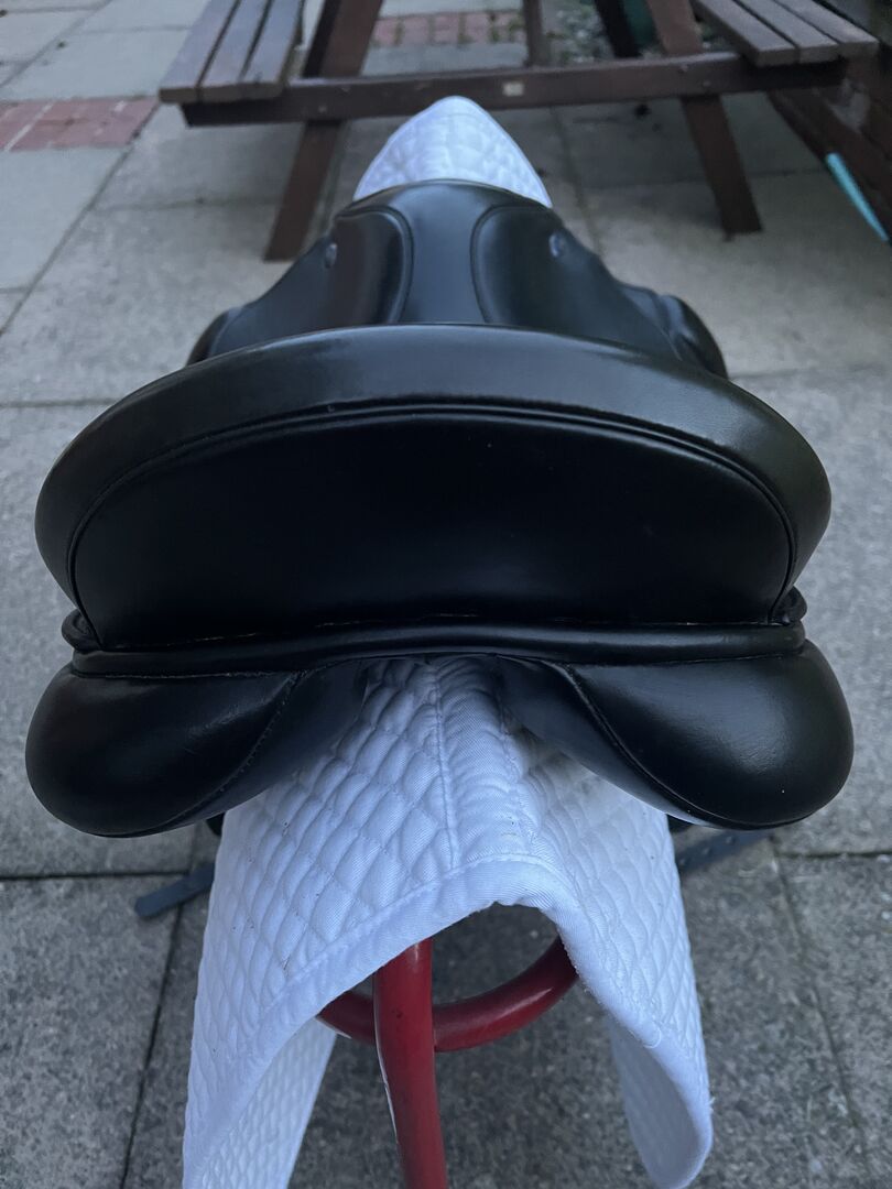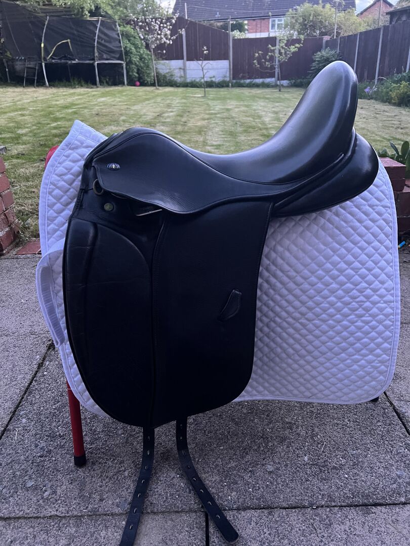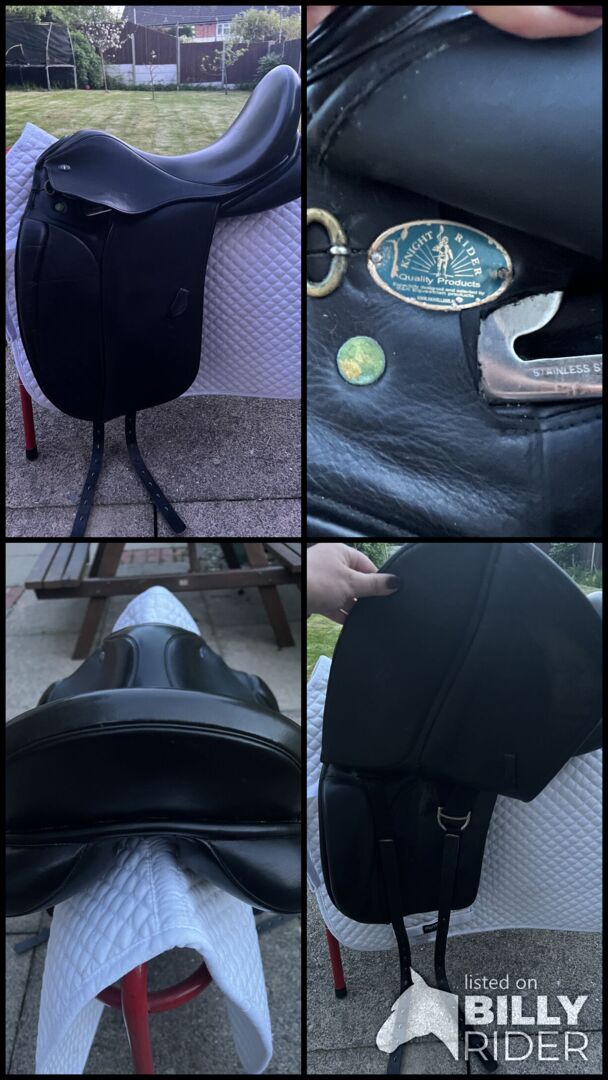 Black Knight Rider Medium 17.5 Dressage Saddle. Well looked after and lovely to ride in. For sale as it doesn’t fit any longer. Sensible offers around £350 and buyer must collect. I paid £675 for this saddle and it has hardly been used. There are barely any noticeable marks on the girth straps and it wouldn’t be forsale if I could make it wider.