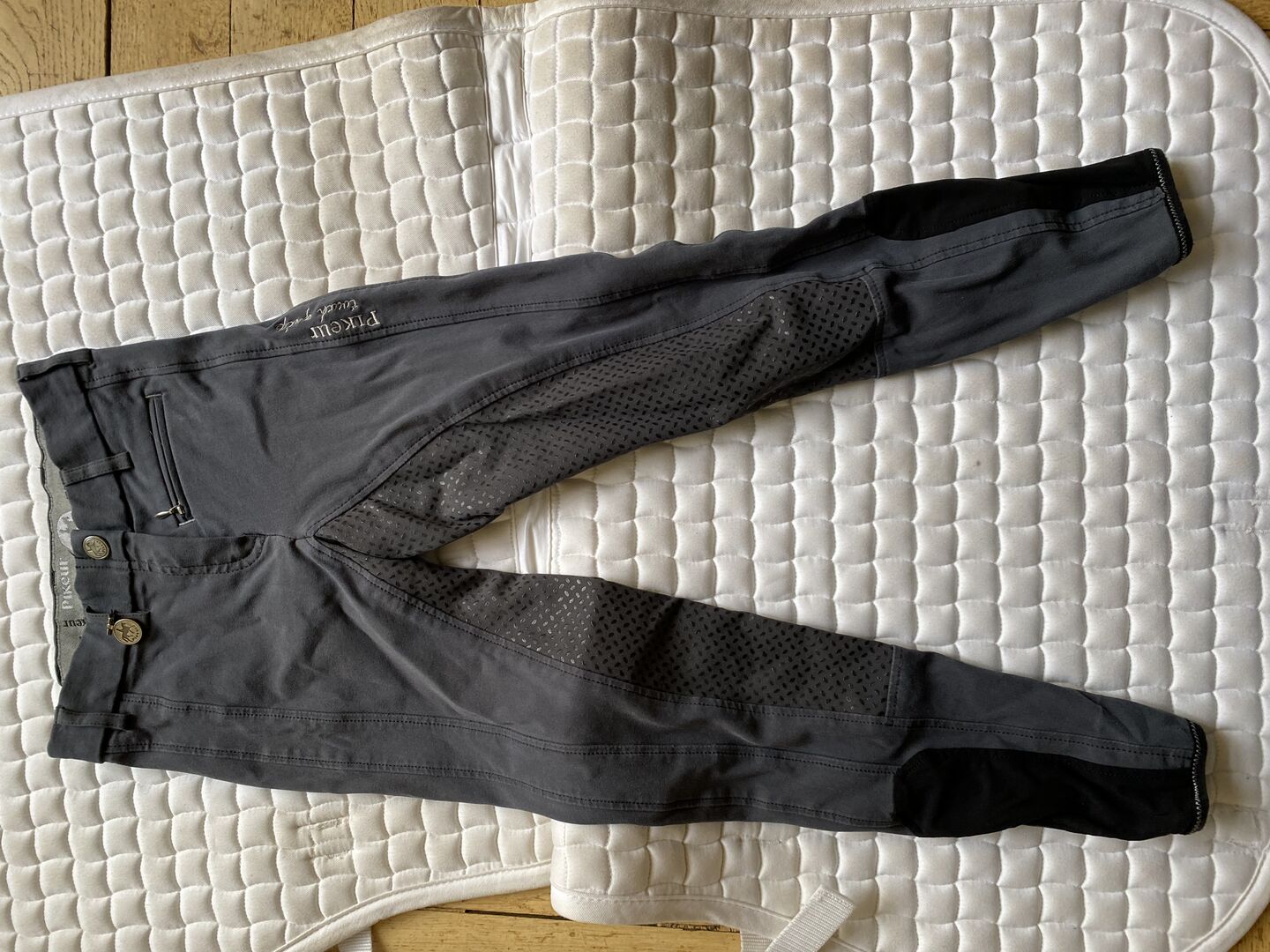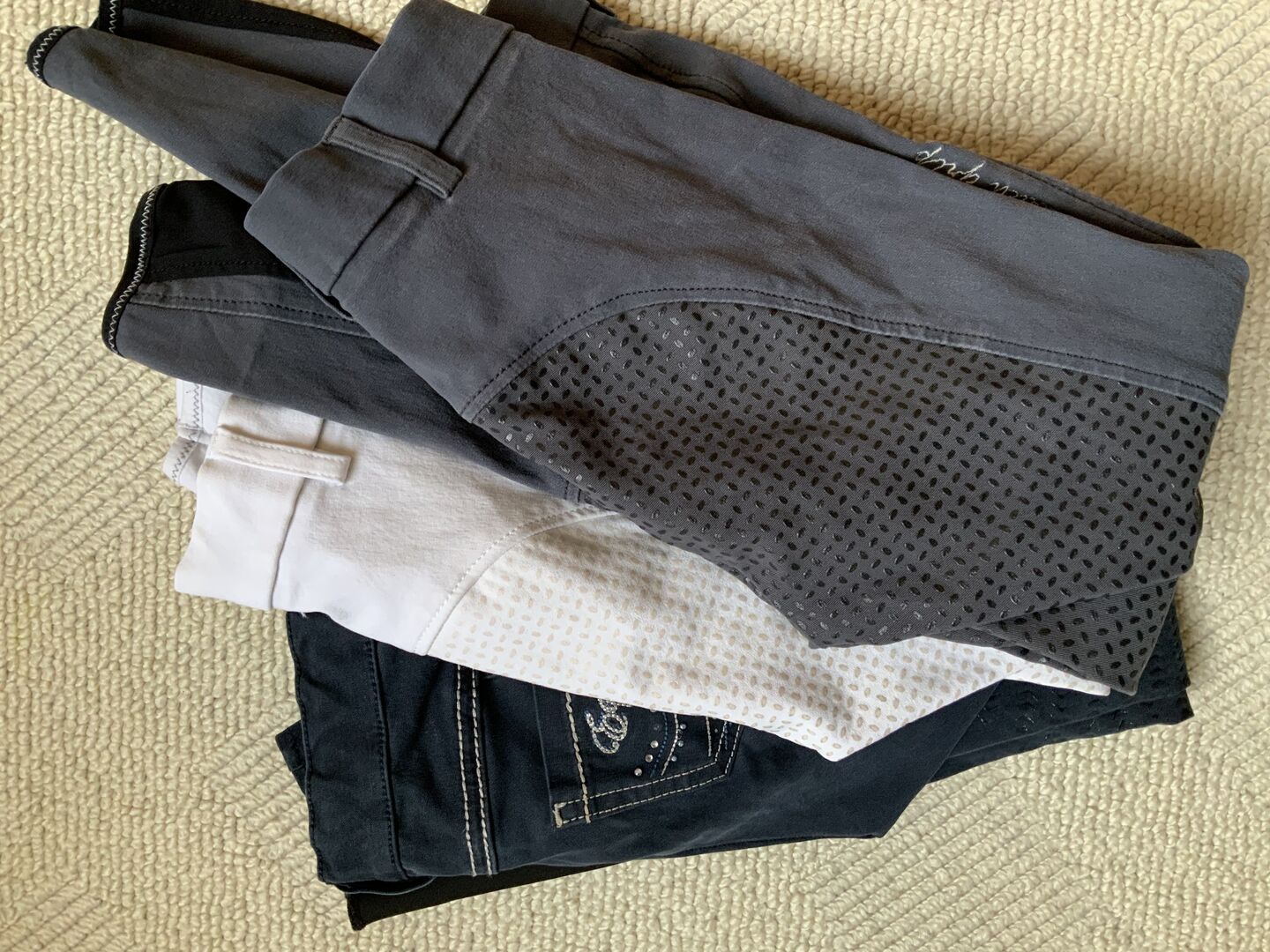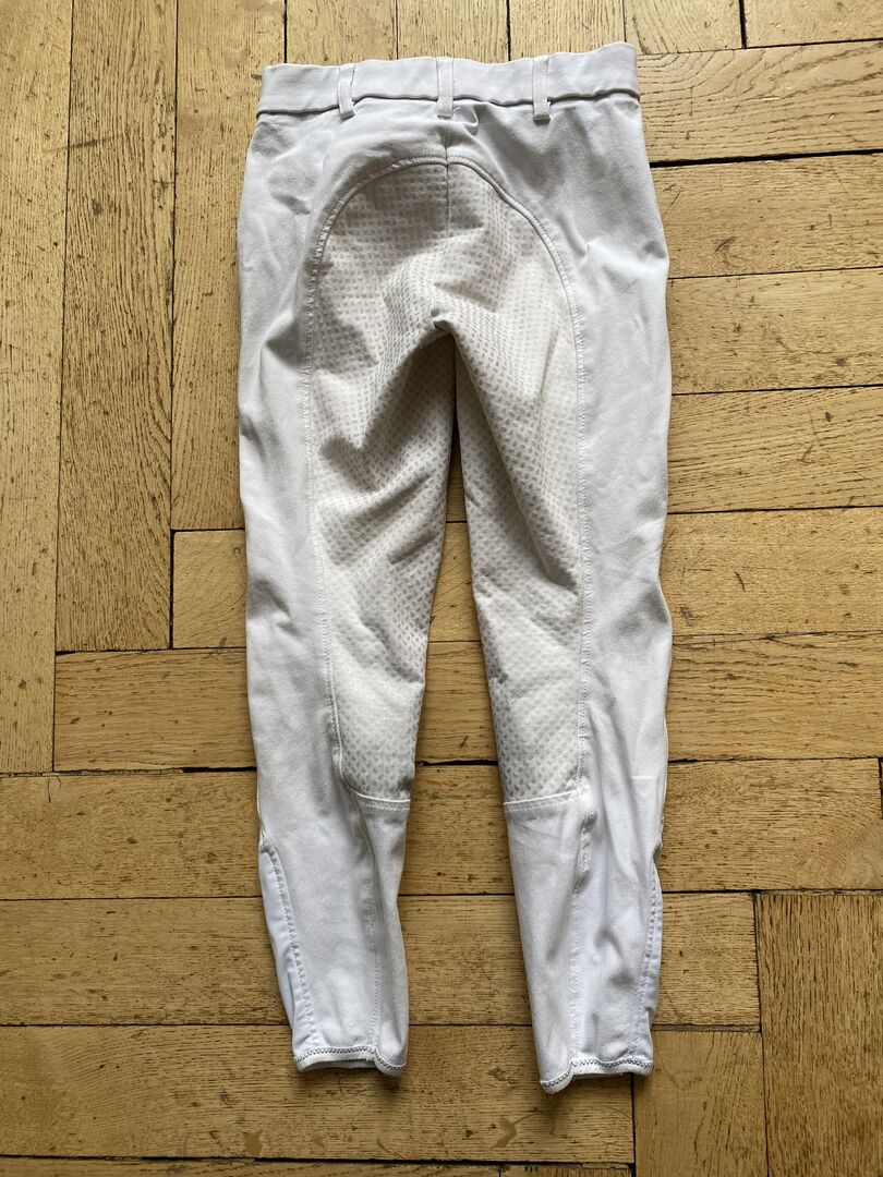 3 Bryczesy jeździeckie dla dziewcząt / pełne siedzisko - Oferujemy 3 piękne bryczesy w rozmiarze 140: 2x Pikeur: jeden w szarych i jeden w białych bryczesach konkursowych. 1x Equilibre: niebieskie z wykończeniami z dżetów z przodu i na tylnych kieszeniach, cena dotyczy pakietu trzech spodni.