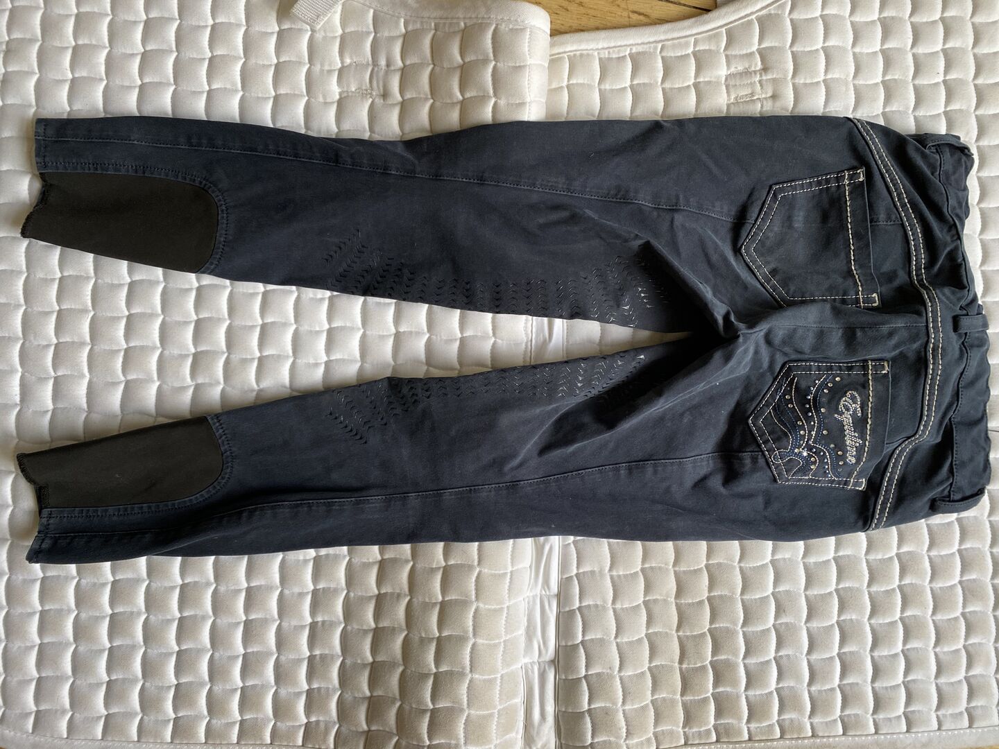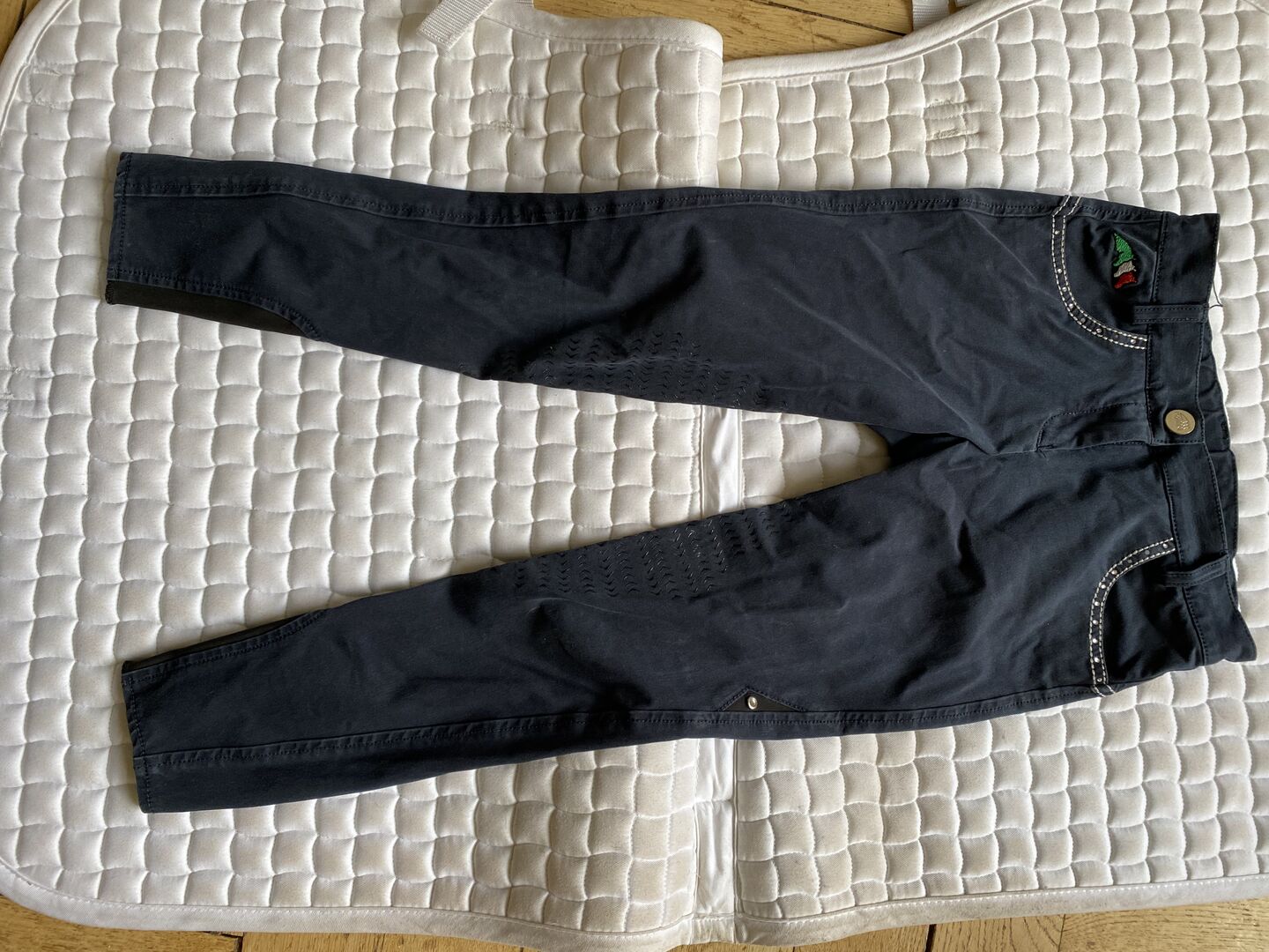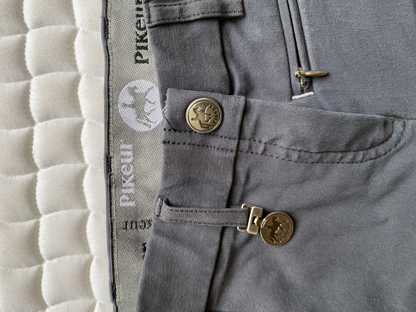 3 Bryczesy jeździeckie dla dziewcząt / pełne siedzisko - Oferujemy 3 piękne bryczesy w rozmiarze 140: 2x Pikeur: jeden w szarych i jeden w białych bryczesach konkursowych. 1x Equilibre: niebieskie z wykończeniami z dżetów z przodu i na tylnych kieszeniach, cena dotyczy pakietu trzech spodni.