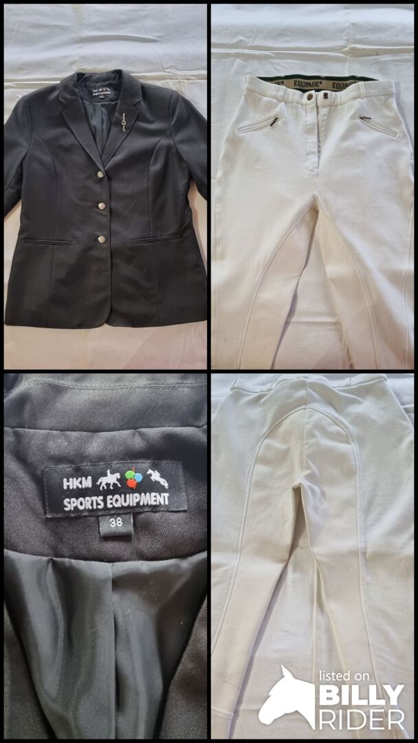 3-częściowy zestaw turniejowy rozmiar 38 - Założony tylko raz na test jeździecki, bez śladów zużycia. Marynarka konkursowa w kolorze czarnym w rozmiarze M, bluzka konkursowa biała / różowa z 2 kołnierzykami i białe bryczesy konkursowe wszystkie markowe. Chciałbym sprzedać jako zestaw. Pierwotna cena wynosiła 220 euro!