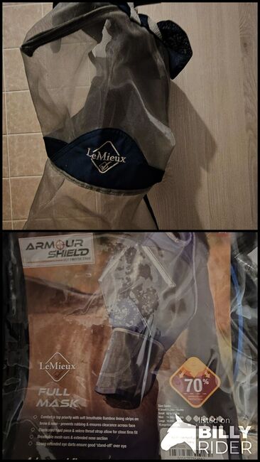 3 Maska na muchy LeMieux ArmourShield Pro rozmiar L - Sprzedam w sumie 3 maski przeciwsmogowe ArmourShield Pro firmy LeMieux w rozmiarze L w bardzo dobrym stanie. Mam ich 3 sztuki, które wymieniałam i czyściłam, gdy były brudne. Niestety okazały się trochę za duże na moją klacz i obtarła sobie twarz (bo nie pasowały) (typowa pleśń 🫣).