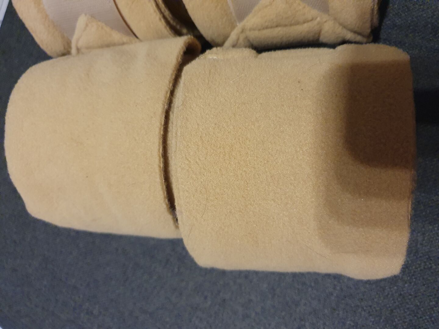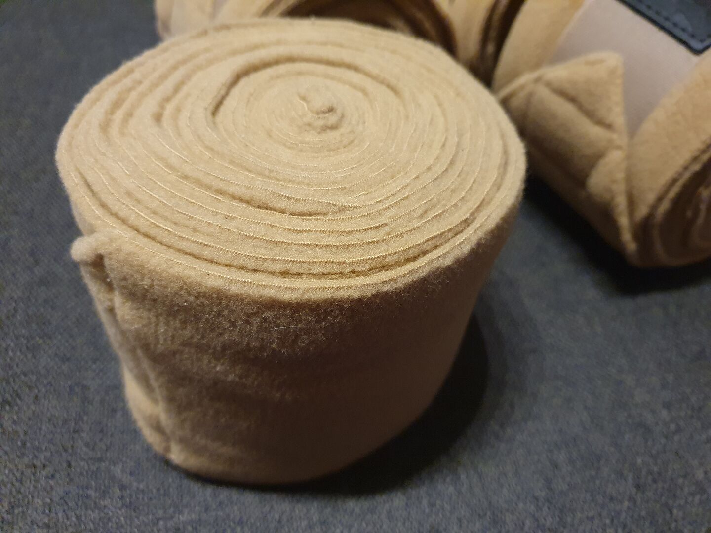 4 nowe bandaże Mattes, beżowe / wielbłądzie - Oferuje nieużywany zestaw 4 grubych bandaży polarowych firmy Mattes w kolorze beżowym. Nigdy nie były na koniu, ale mogły mieć kilka włosów na sobie, bo były w boksie w stajni.