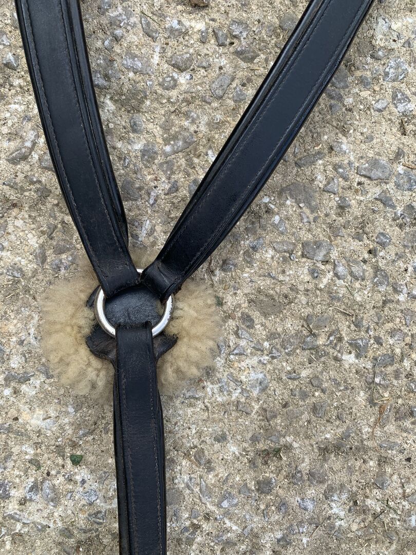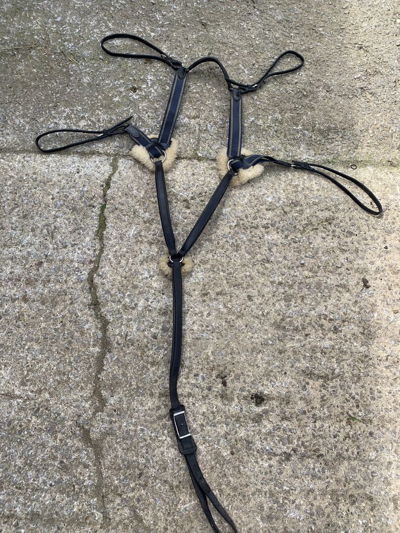 Black 5 point elasticated breast plate. Blue and yellow elastics red inserts NON removable fluff.