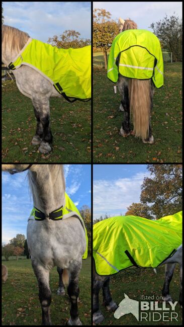 600D Ripstop Epoch specjalny materiał zewnętrzny koca 3000 mm słupa wody fluoro żółty z odblaskowymi paskami, bardzo oddychająca według producenta od -20° do + 45° (patrz etykieta), Polarowa wyściółka na kłębie, szyi i ramionach, klejone szwy, 100% wiatroszczelna, 100% oddychająca, 100% wodoodporny, 100g na plecach, przyjazna dla futra podszewka z tafty od spodu Zapięcie na piersi w kształcie litery T z gumowym pierścieniem zapobiegającym przypadkowemu otwarciu, Krzyżowe szelki z gumowym pierścieniem zapobiegającym przypadkowemu otwarciu, głęboko osadzona klapa na ogon, górna linka ogonowa, dolny pasek z karabińczykiem zapobiega zwijaniu się koca podczas zwijania, z kieszenią na zamek błyskawiczny