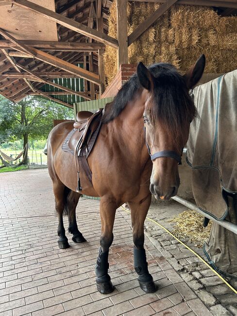 Absolutnie niezawodny koń, koń rekreacyjny - Jeśli wszystko pasuje, mogę zaoferować mojego 10-letniego, silnie zbudowanego wałacha. Jest regularnie odrobaczany, ma kowala co 6-8 tygodni i jest obecnie boso. Latem stoi na pastwisku 24/6, a zimą w boksie w nocy. Jest częścią mieszanego stada i jest absolutnie zgodny, raczej wysoki w randze.