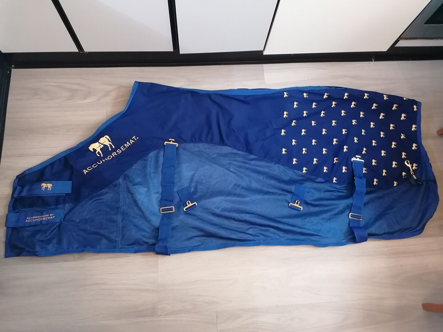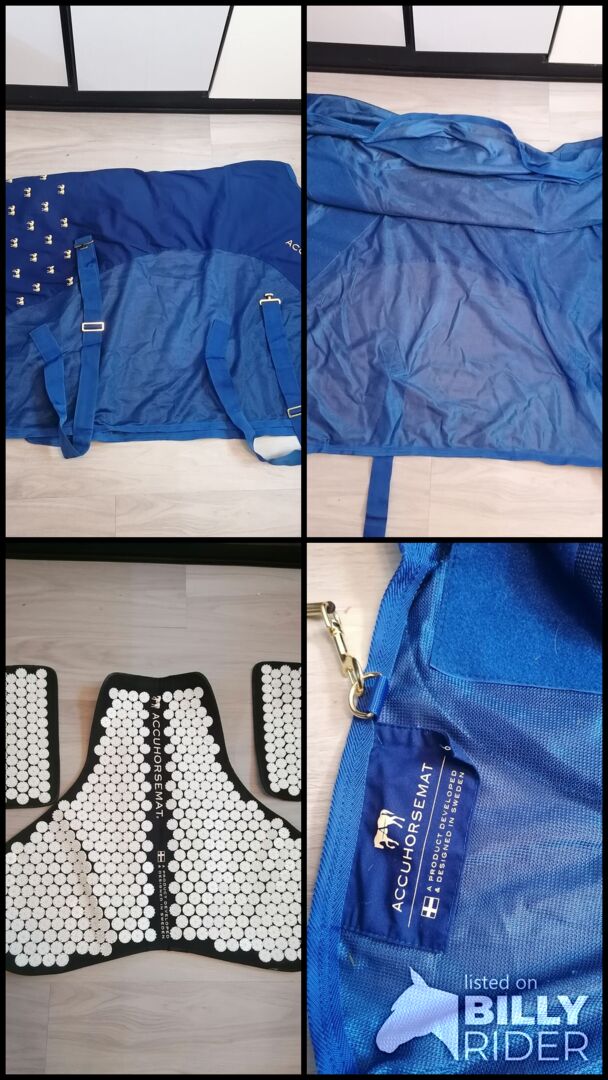 Accuhorsemat rozmiar M - Sprzedam oryginalną derkę do akupresury dla koni Accuhorsemat w idealnym stanie w rozmiarze M (130-145 cm). W komplecie 3 maty do akupresury, torba i opis. Była dobrze pielęgnowana, była na moim koniu tylko kilka razy i jest sprzedawana wyprana. Sprzączki i zapięcia są również w idealnym stanie. NP wynosiło 290,--.