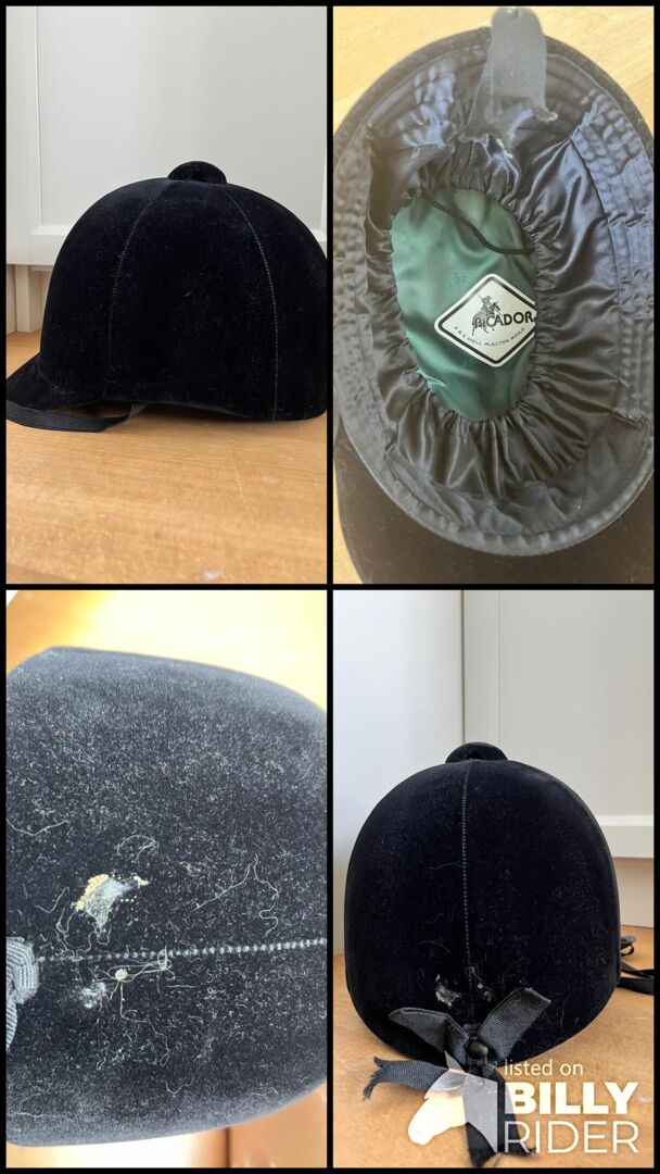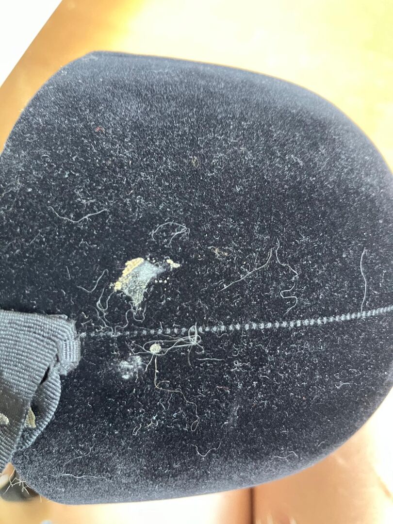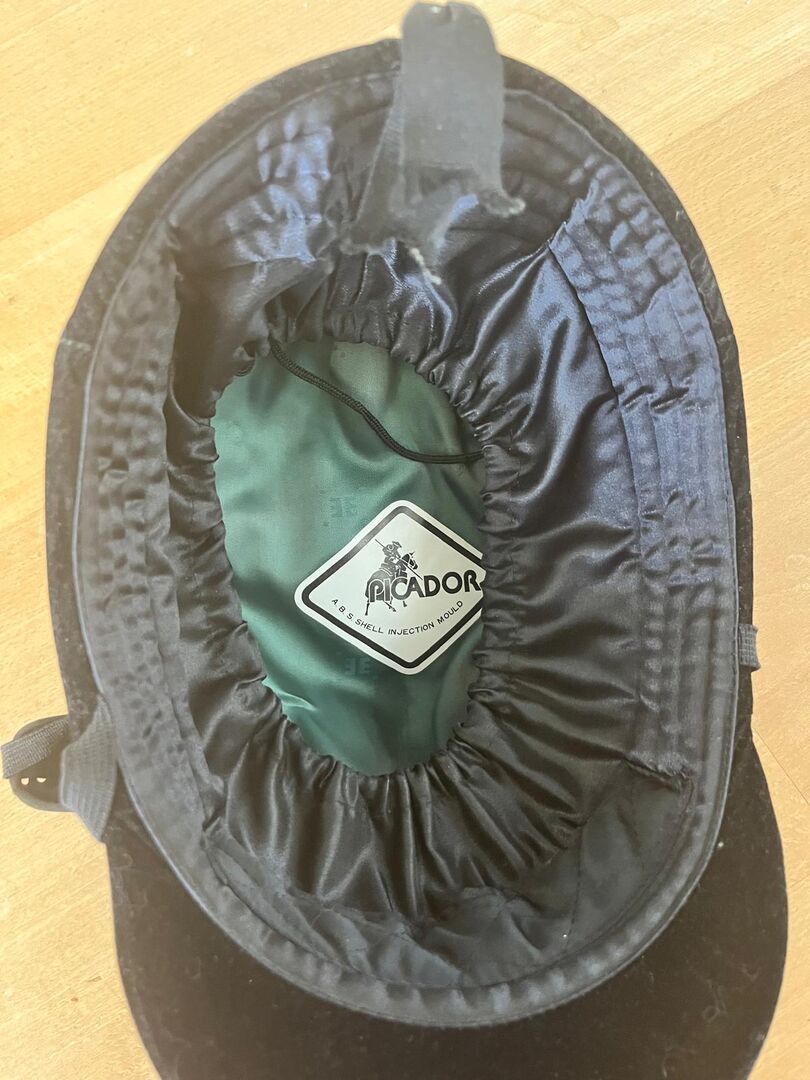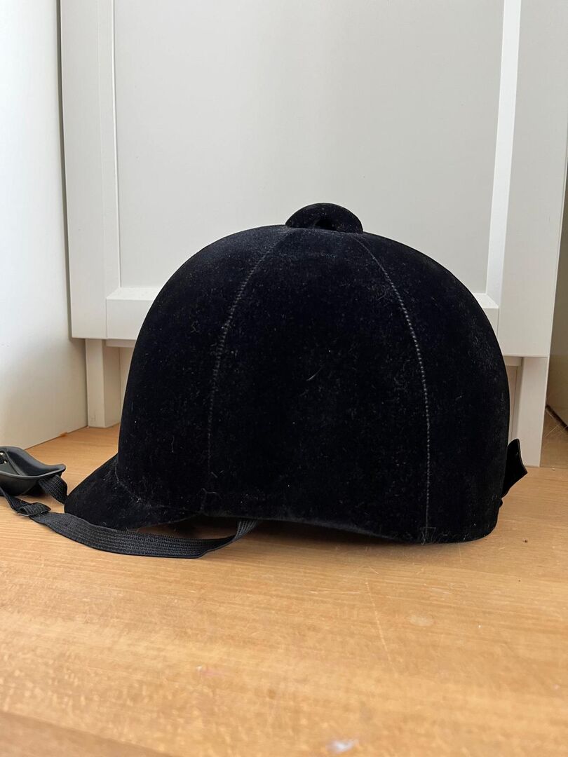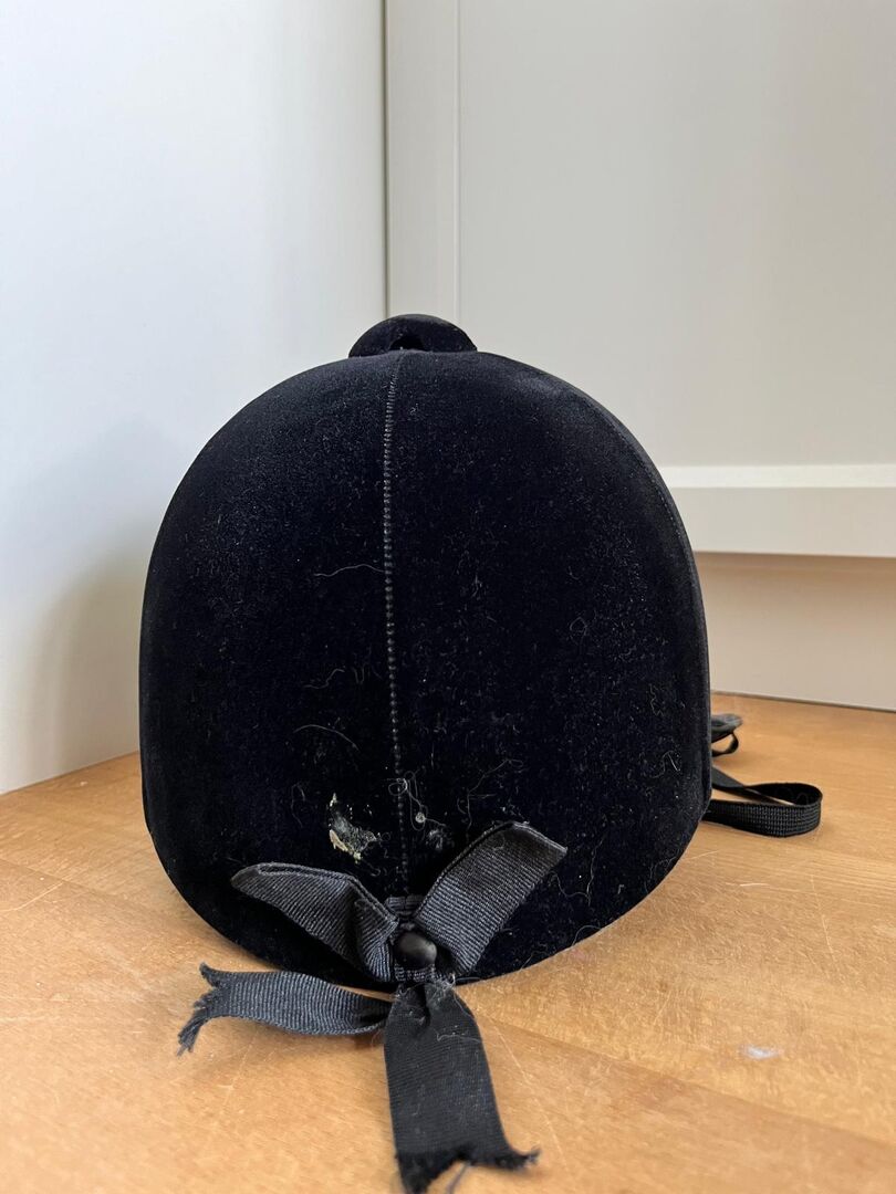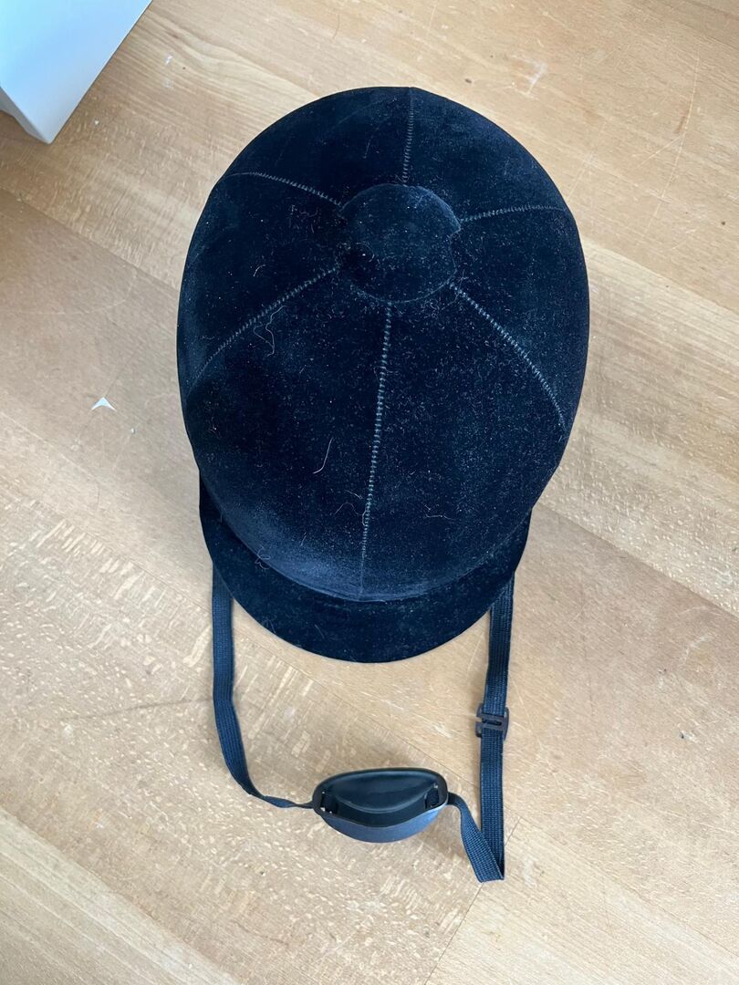 Aksamitny kask jeździecki - Aksamitny kask jeździecki z osłoną podbródka. Marka nieznana. Wyprodukowano w Korei Południowej. Rozmiar: 7 1/4 = obwód głowy 59 cm w dobrym stanie. Oderwanie materiału z tyłu głowy (patrz zdjęcie)