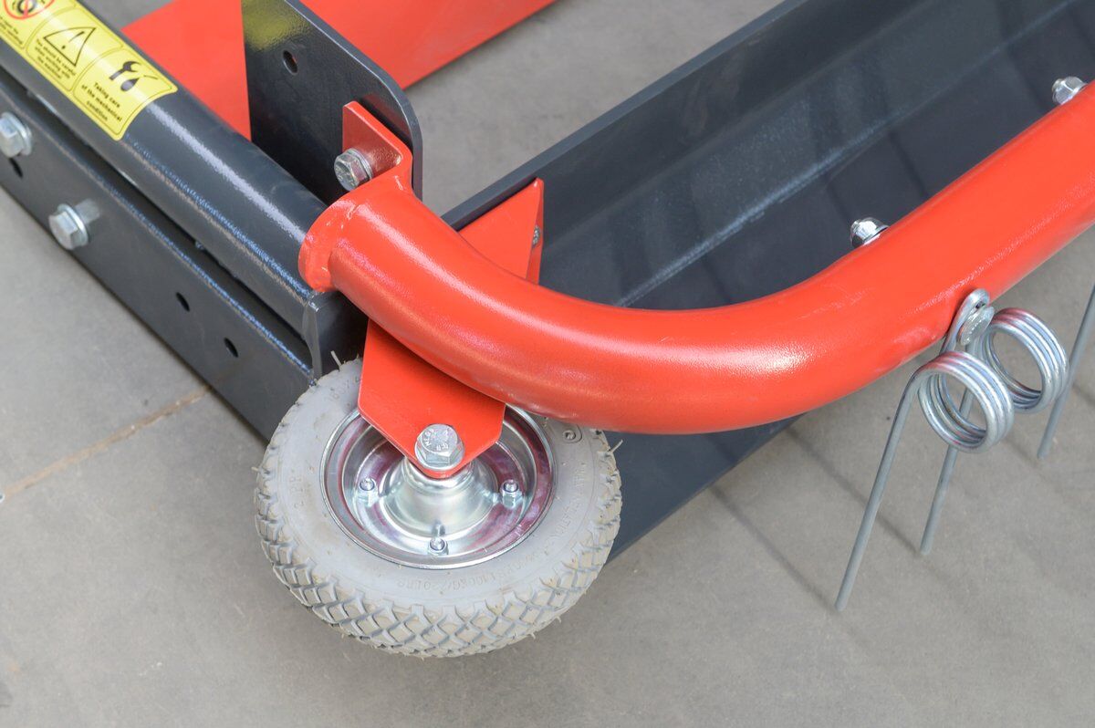 The grader includes two distance wheels that protect arena walls, mounted on the left and right sides of the frame. The included side track rake is adjustable, ensuring it fits into the grader’s operational area for thorough leveling.