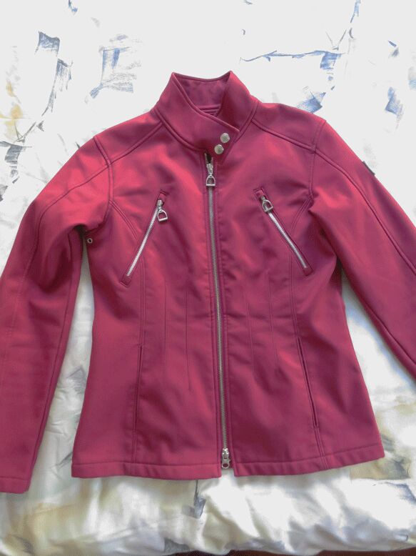 Świetna kurtka na zimę od Ariat w kolorze jagodowym (nie różowym, ani nie szarym!). Materiał softshellowy, wewnątrz lekko ocieplony polarem - bardzo dobra jakość, idealna na zimę. Poza 2 pasami RV są jeszcze 2 pasy do noszenia. Wiele pięknych detali, patrz zdjęcia - bez kołnierzy.
