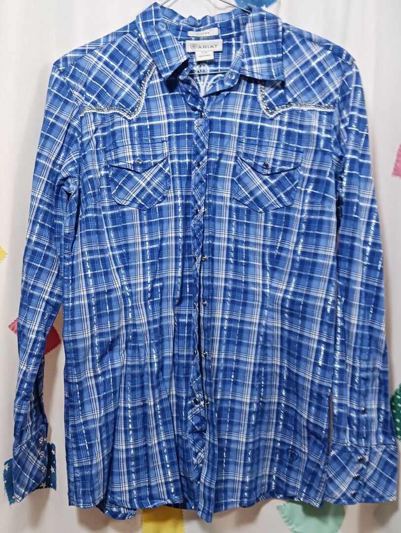 Shirt in like new condition. Silver is flashy and has beaded detailing. Snap buttons all work. No tears or damage.