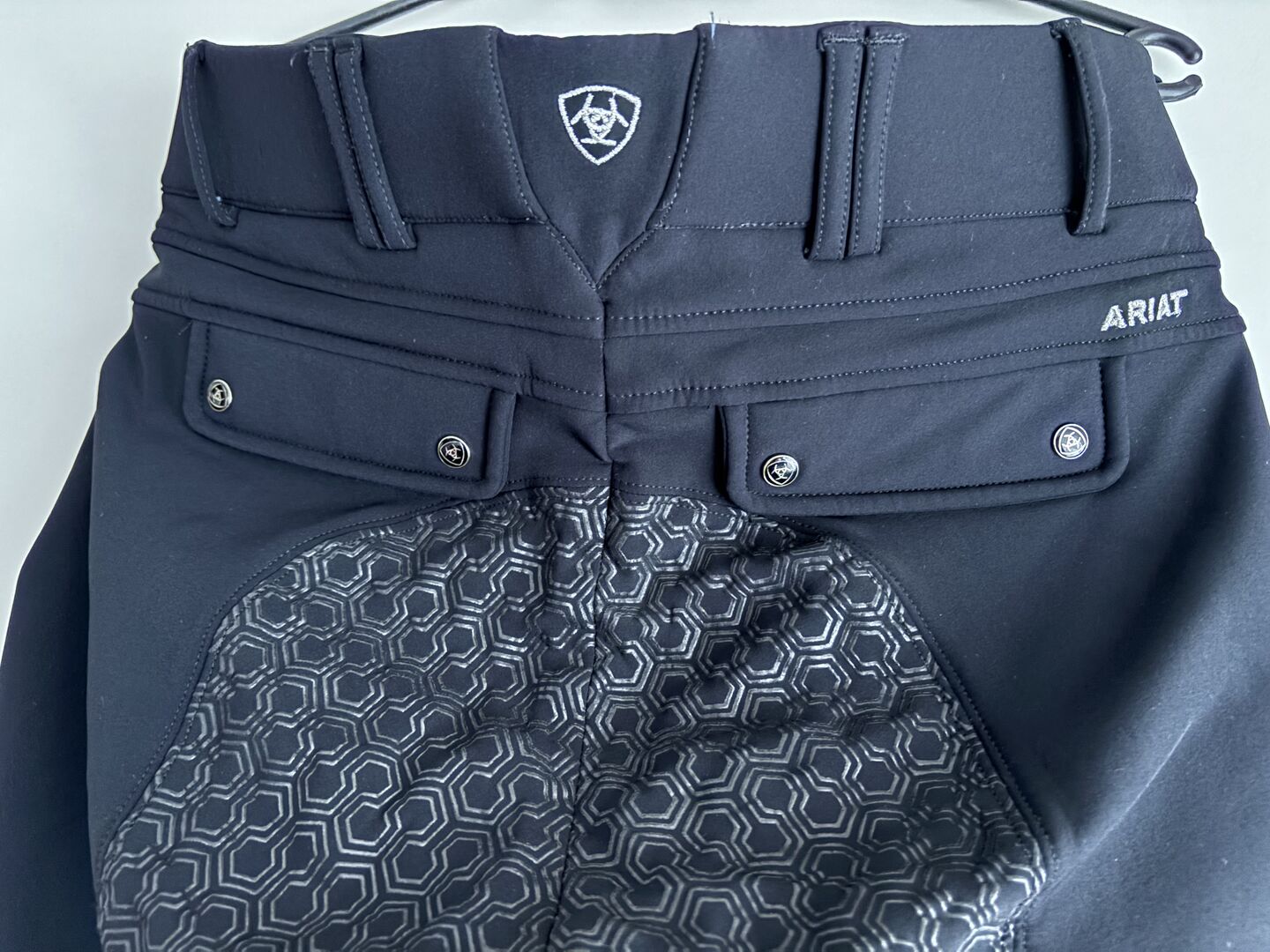 Cechy: Core Control Technology ™ umożliwia smukłą sylwetkę Calf Fit System ™ (CFS ™) zapewnia dokładne dopasowanie kompresji pod butami Pas Ariat® V3® zapewnia ścisłe, ale elastyczne dopasowanie do różnych pozycji bioder Technologia Moisture Movement Technology™ odprowadza wilgoć ze skóry Pełne siedzisko wykonane z antypoślizgowego silikonu z teksturowaną powierzchnią zapewnia bezpieczne trzymanie w siodle Odporność na wiatr Efektowna dekoracja z logo Kieszenie z patką z tyłu