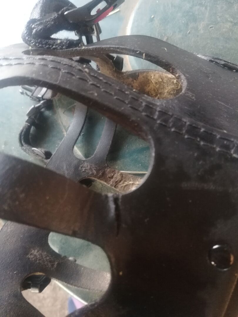 Na dolnej stronie (podbródek) jest trochę rozdarta (ale nie na wylot, fot. 3)) i na jednej klamrze jest trochę naderwana (fot. 4)....