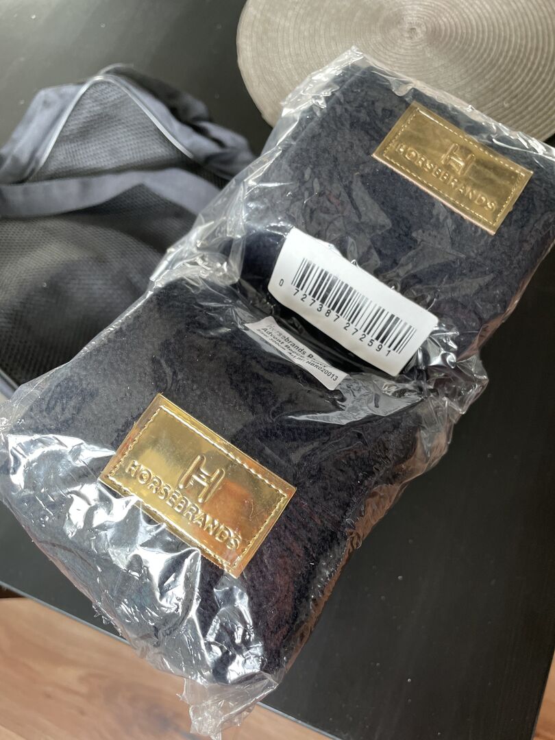 Bandaże Horsebrands z woreczkiem - Sprzedam 4 nowe i oryginalne bandaże firmy Horsebrands. Opatrunki są wykonane z ciemnoniebieskiej włókniny ze złotym znakiem firmowym. Znajdują się one w wysokiej jakości torbie.