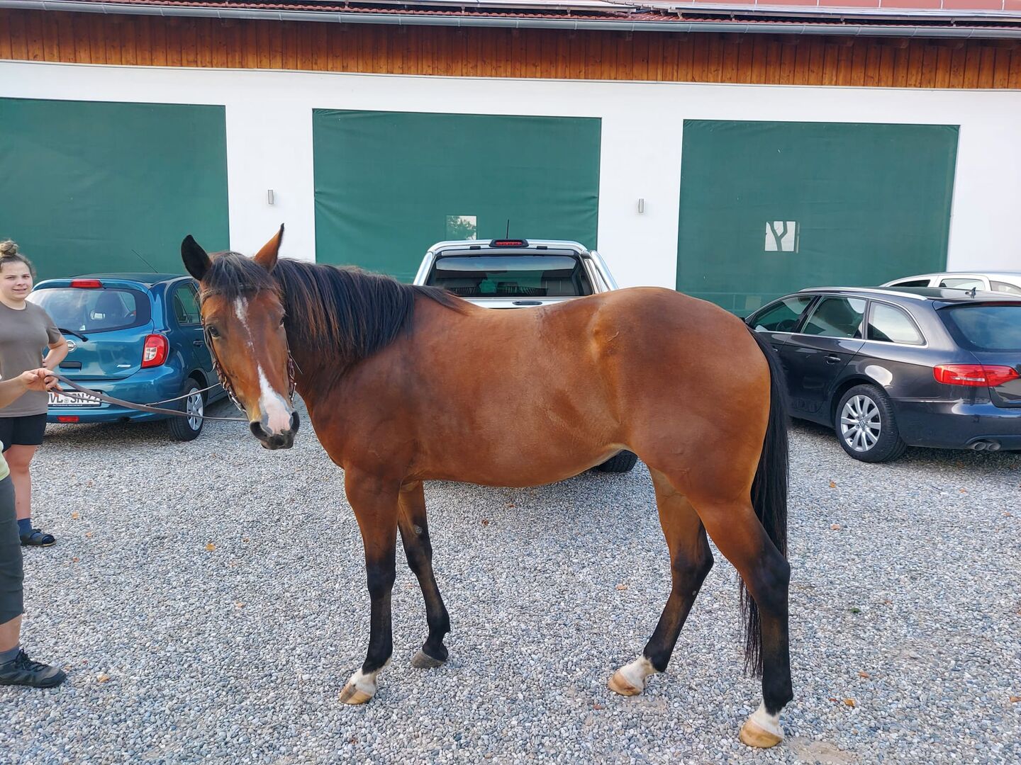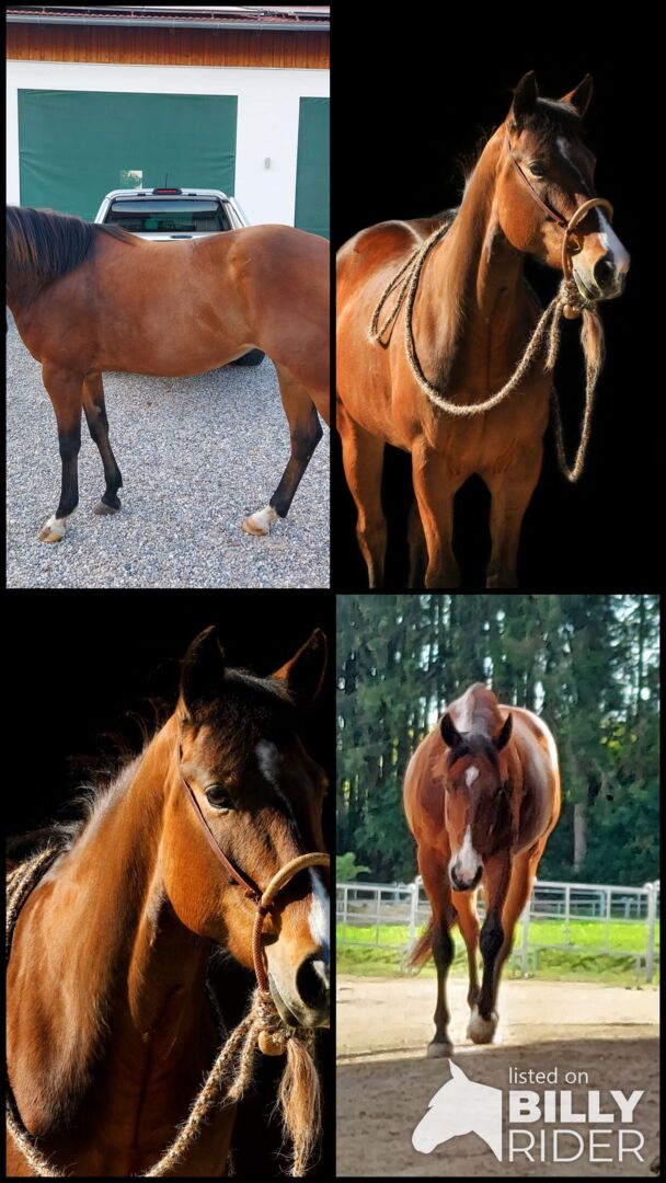 bardzo poprawna klacz rasy Quarter Horse - Szukamy nowego 5-gwiazdkowego domu dla tej wspaniałej klaczy Quarter Horse, ponieważ niestety nie urosła tak silna i wysoka, jak się spodziewaliśmy. Niestety, proporcje konia i jeźdźca nie pasują do siebie. Püppynella" to 6-letnia, absolutnie poprawna klacz rasy Quarter Horse z doskonale wyhodowaną linią użytkową do cuttingu i reined cowhorse. Ma ok. 148 cm wzrostu i gniadą maść. Klacz jest raczej drobna i nie jest nośna, ale ma zrównoważoną muskulaturę. Püppynella jest bardzo przyjazna i ma przystępny, zorientowany na ludzi charakter. Nie trzeba dodawać, że jest dobrze wychowana i całkowicie bezproblemowa u weterynarza, przy pielęgnacji kopyt (gołe kopyta), na wieszaku i w obsłudze. Była regularnie szczepiona i poddawana przeglądom stomatologicznym, a także fizjoterapii i osteopatii. Mieszka w otwartej stajni i jest bardzo dobrze wychowana. Zna również boks w nocy i ćwiczenia w ciągu dnia. W 2022 roku została na krótko zajeżdżona i zajeżdżona (chód i kłus). Następnie została ponownie wypuszczona na pastwisko, ponieważ nie była jeszcze tak daleko w swoim rozwoju. Obecnie jest gimnastykowana w ręku, a także wychodzi w teren i na drogę. Idealnie byłoby, gdyby ktoś z doświadczeniem w szkoleniu młodych koni był w stanie spokojnie i ostrożnie przekwalifikować klacz. Klacz jest przebadana na 5 panelach n/n. Miała wspaniałego źrebaka. Ciąża i poród przebiegły bez komplikacji, a klacz była kochającą matką. Ze względu na solidny rodowód jest również interesująca do hodowli. Püppynella jest sprzedawana jako niejeżdżona. Ponieważ jest bardzo słodkim koniem, zostanie sprzedana tylko w najlepsze ręce.