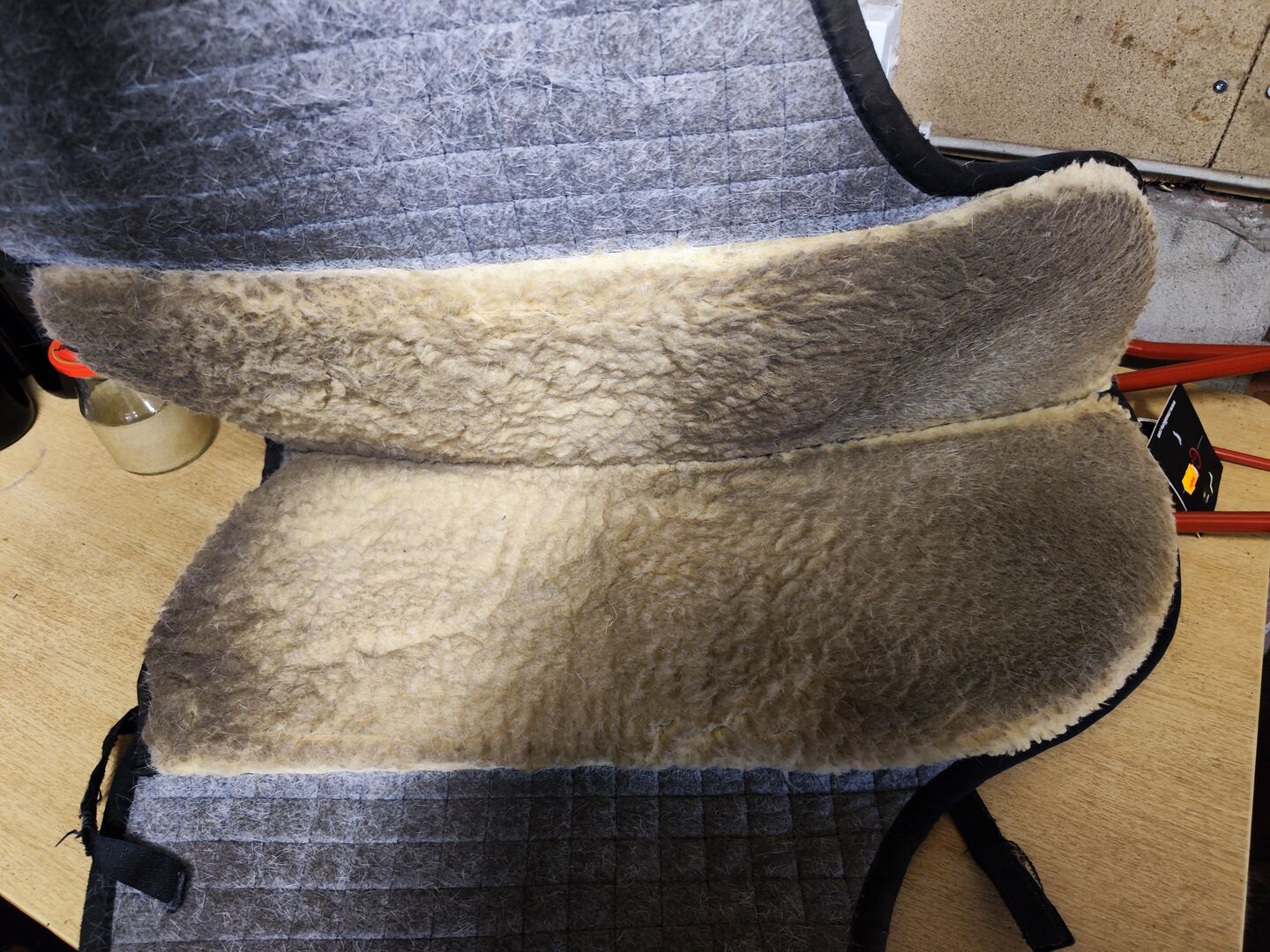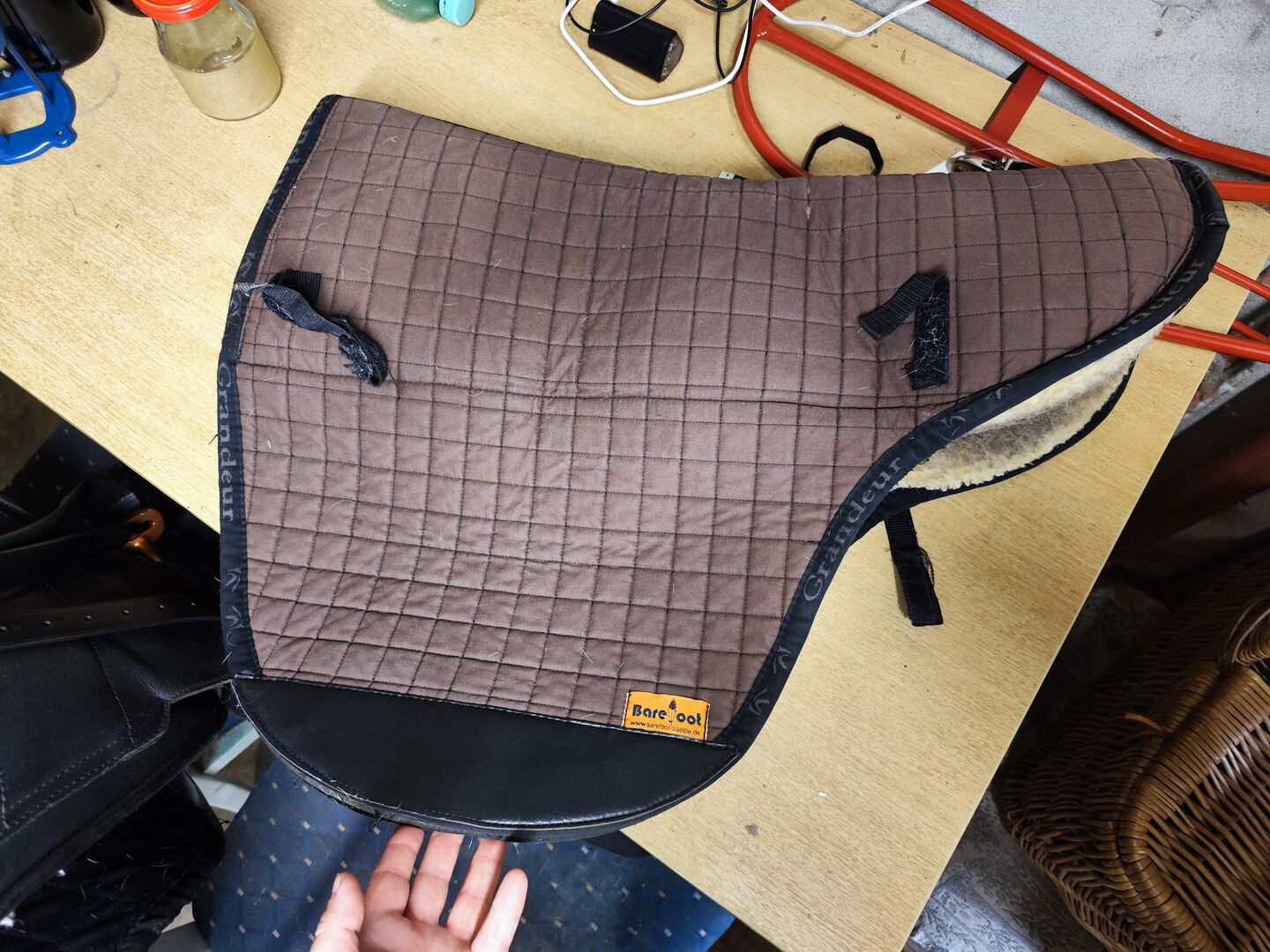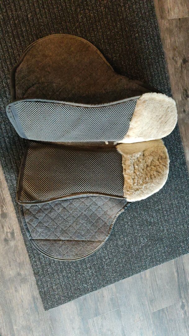 Osobno kupiłem pasującą podkładkę pod siodło Barefoot Physio, która teraz będzie wliczona w cenę. Miękka, jasnoszara piankowa wkładka została włożona, czarna wkładka z gumy komórkowej została przycięta, aby pasowała (2/3 wkładki zostało włożone jako podwójna wyściółka w physiocushion zgodnie z konsultacją Barefoot, z której korzystałem, gdzie zaczyna się jagnięca skóra na panelu, a następnie kończy się podwójna wyściółka). Ostatnia trzecia część wyściółki jest dodawana jako rzecz oczywista i oczywiście może być również wstawiona w razie potrzeby.