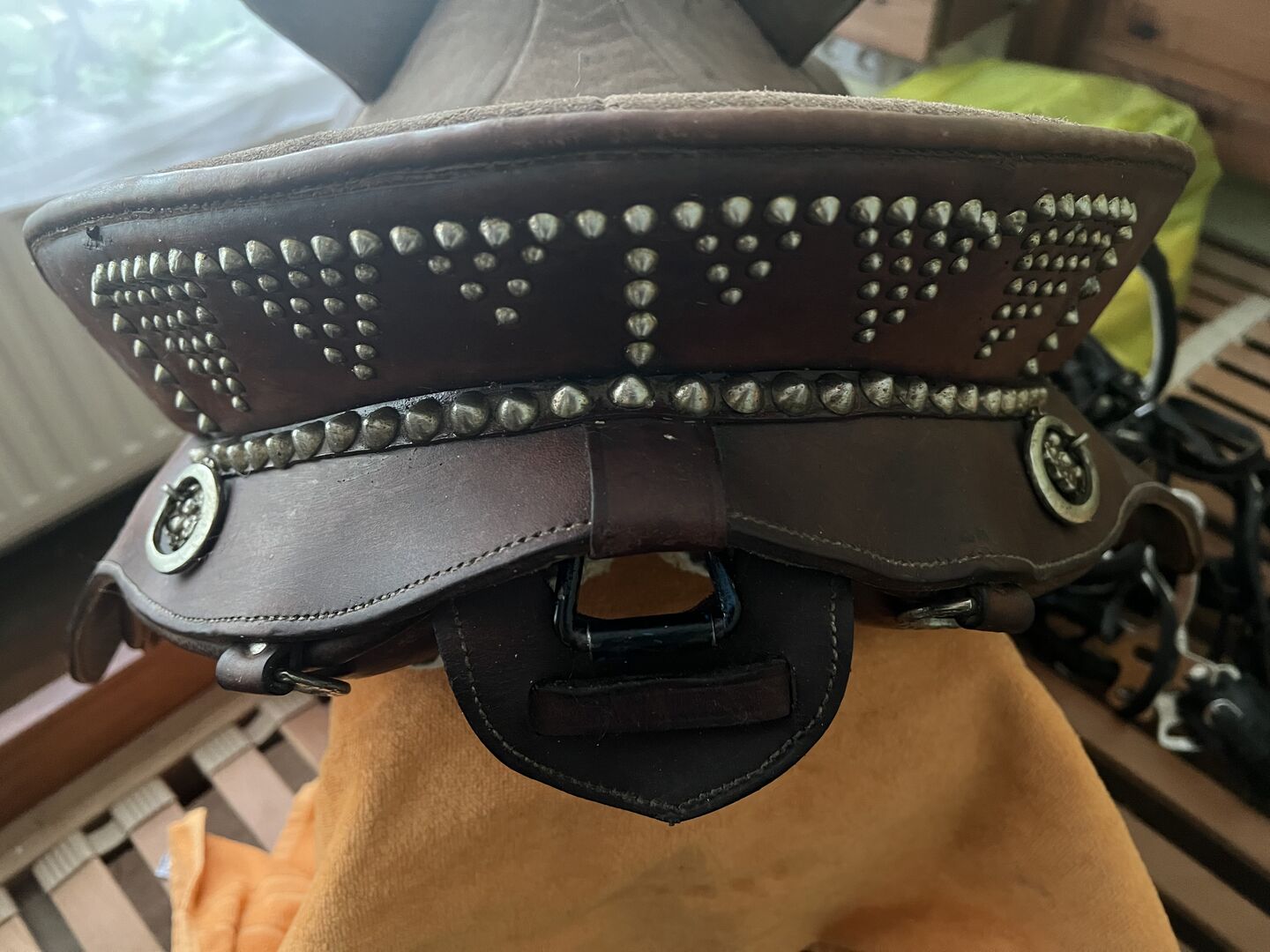 Barokowe siodło Gomez hiszpański portugalski - dobrze zachowane siodło z dobrej skóry od Gomeza. Brak otwartych szwów. Zobacz zdjęcia. Rozmiar siedziska 36 cm. Pasuje na rozmiar 38.