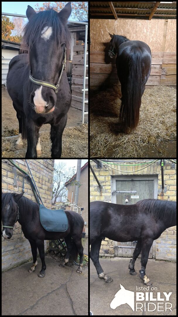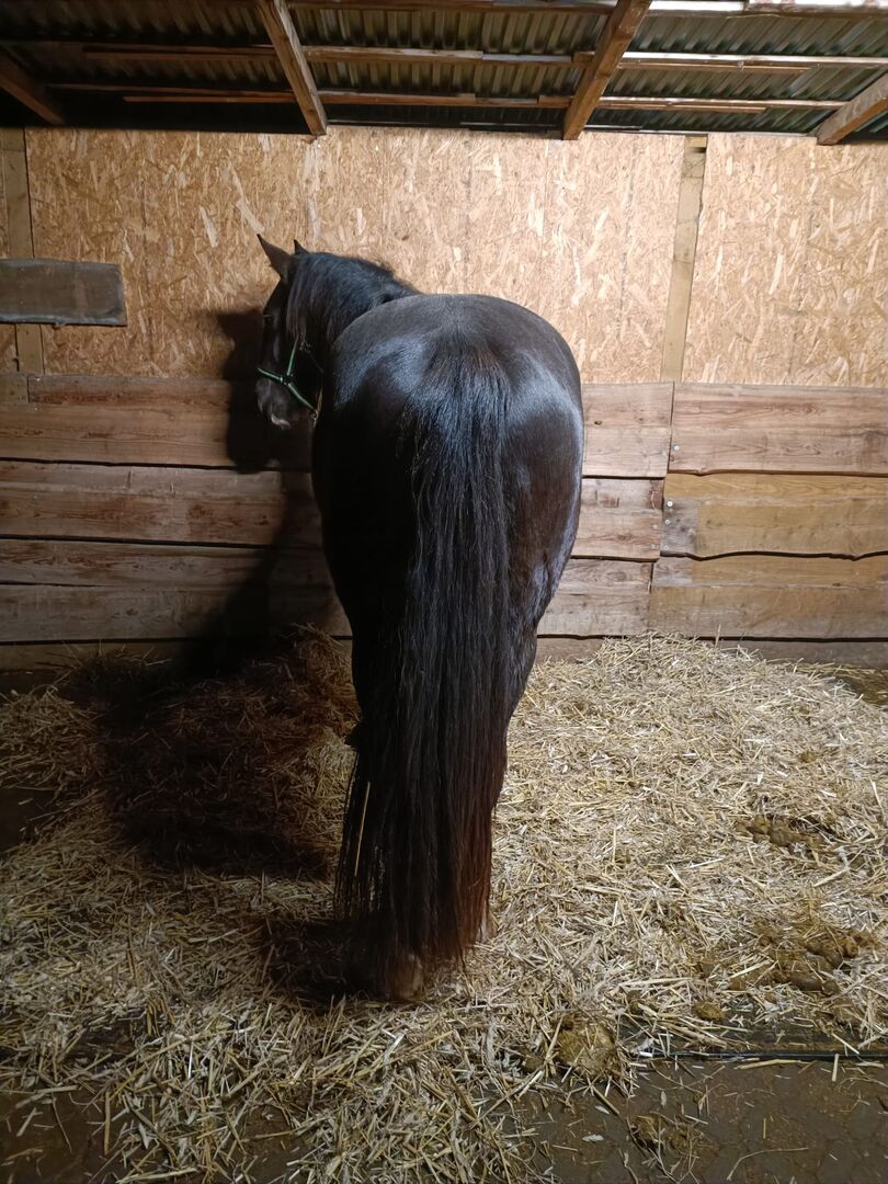 Barokowy surowiec diamentowy pinto - Piękny młody samiec w specjalnym kolorze Smokey Black może trafić do odpowiedniej osoby lub pozostać tutaj w celu dalszego szkolenia. Sprzedaż tylko redukcja zapasów WG, bez sprzedaży w niebezpieczeństwie. Zna źrebięce ABC zgodnie ze swoim wiekiem, zacznie być lonżowany, co robi bardzo dobrze, a także prosi. Wszystko chce robić dobrze. Zna derkę pod siodło, popręg do lonżowania i getry. Chodzi na spacery i obecnie przebywa w otwartej stajni z Wallacenem. Jest bardzo przytulaśny i zorientowany na ludzi. Jeśli chodzi o kolor, zimą jest czarny, a latem gniady z pełną czarną grzywą po obu stronach. Ostateczna wysokość ok. 1,56/-1,58 m. Ze względu na swój charakter może być również wykorzystywany jako koń terapeutyczny po odpowiednim przeszkoleniu. Mama 1,54 m barokowe pinto z dużą zawartością fryzyjskiego. Ojciec 1.63m raczej sportowy typ w specjalnym kolorze. Wszystkie konie są regularnie szczepione, odrobaczane i prezentowane korektorowi kopyt. Jest wyposażony w paszport koni. Jeśli jesteś poważnie zainteresowany, po prostu przyjdź i spójrz.