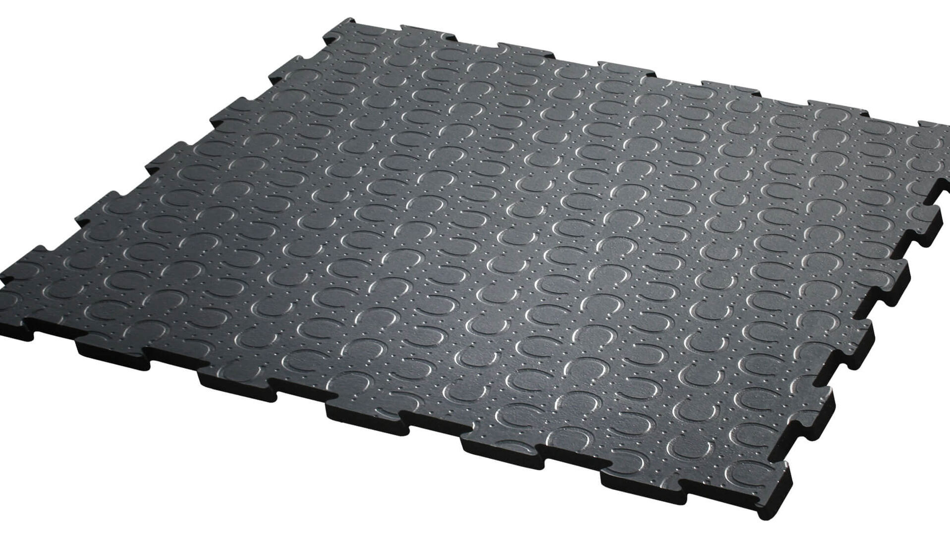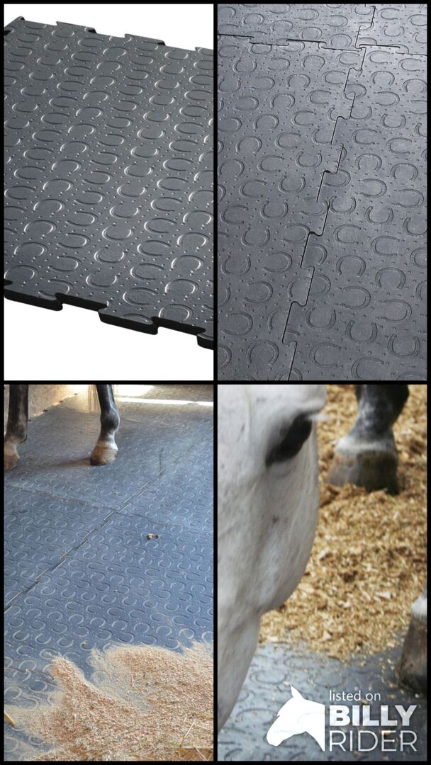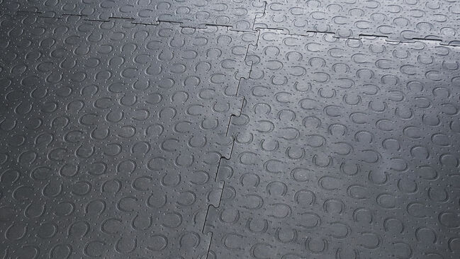 Powierzchnia: Profil podkowy ze zoptymalizowaną pod kątem zużycia warstwą wierzchnią (Odpowiedni dla koni z wypinaczami, szpilkami lub kolcami) Spód: poduszka powietrzna z gumowymi paskami Grubość: 28 mm Wymiary: 1 m × 1 m, układane z 4 stron
