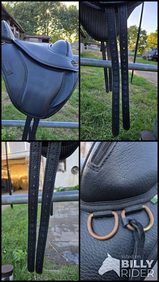 Bezdrzewne siodełko marki Torsion - Super ładne, wygodne siodło bezterlicowe. Prawie jak nowe... widać paski popręgu... absolutnie jak nowe. Siodło demonstracyjne oryginalna cena 1160€ - czarny - 16-calowe siedzisko (46 cm zielona linia na ostatnim zdjęciu) - małe, twarde rolki kolanowe - złote/brązowe pierścienie do zapięć - skórzane paski (np. do przechowywania kurtki) - z wycięciem - regulowane mocowanie strzemion - Spód Endurance, który jest wyściełany i konfigurowalny oprócz ochraniacza