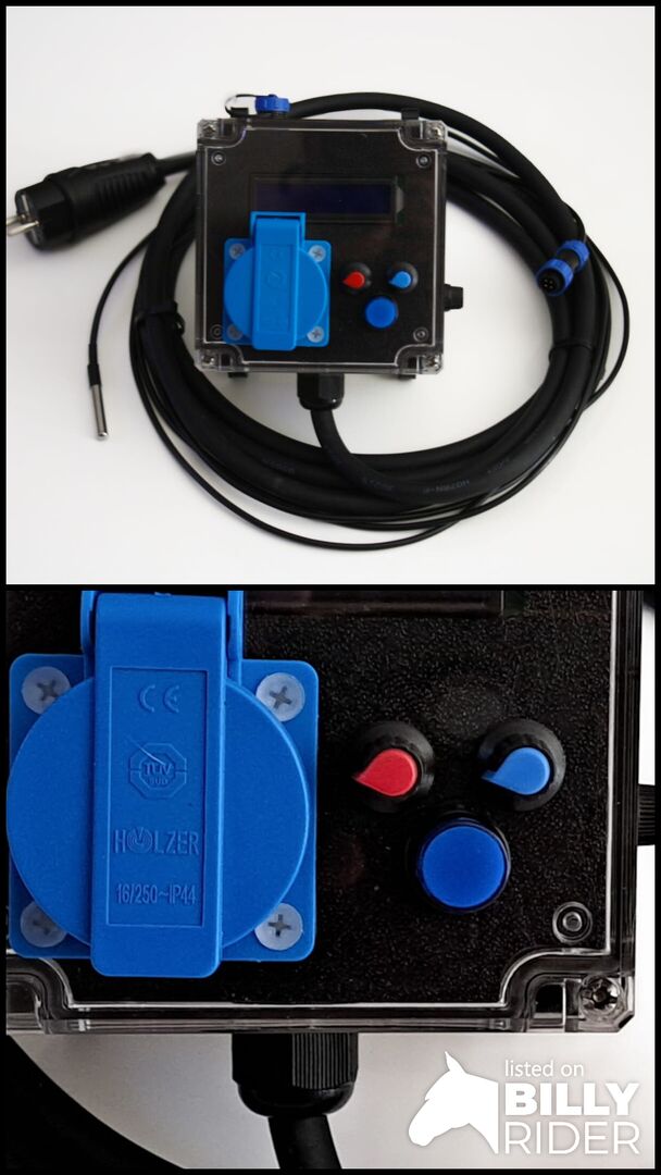 Wstępnie ustawiony czas podtrzymania/po zakończeniu pracy Istnieje możliwość samodzielnego wybrania żądanego czasu wstrzymania/po zakończeniu pracy poprzez naciśnięcie i przytrzymanie niebieskiego przycisku. Pozwala to optymalnie zaspokoić potrzeby konia, ponieważ nie każdy koń może poradzić sobie z czasem po biegu wynoszącym 5 minut. Czasami potrzeba 10 lub 15 minut.
