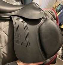 Prawie nieużywane czarne siodło do skoków przez przeszkody z półpłaskim siedziskiem. Fantastyczne siodło dla wysokiego jeźdźca o długich nogach. Bez grzbietu, z poduszkami z lateksu, szerokim kanałem, który można regulować przed sprzedażą.