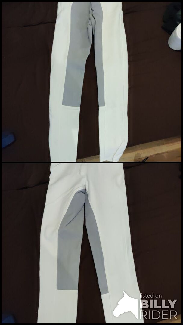 Białe bryczesy jeździeckie z pełnym siedzeniem - Oferuję parę białych bryczesów jeździeckich, które były rzadko noszone. Ponieważ zrezygnowałem z pokazywania, bryczesy są na sprzedaż.