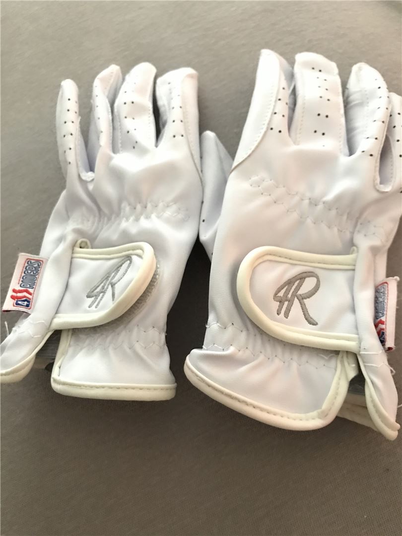 Białe rękawiczki do jazdy konnej - - 2 pary białych rękawiczek do jazdy konnej - imitacja skóry i tkaniny z gumowymi ćwiekami - niewielkie zużycie skóry (patrz zdjęcia) - dodatkowo mam do rozdania garść gum White Mane