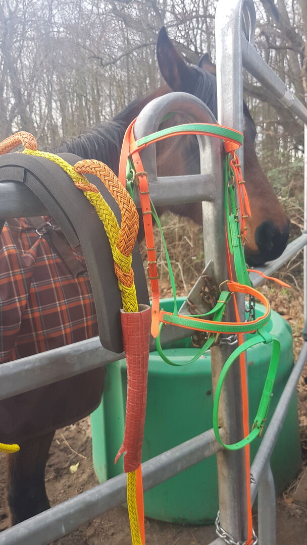 Biotane Pony Snaffle od Tajara Horsewear - Pomarańczowo-zielony snaffle (łączony noseband) z pomarańczowymi reinsami od Tajara Horsewear. Mega praktyczne, bo odporne na warunki atmosferyczne i łatwe do utrzymania w czystości (w pralce lub zmywarce). NP ok. 170€