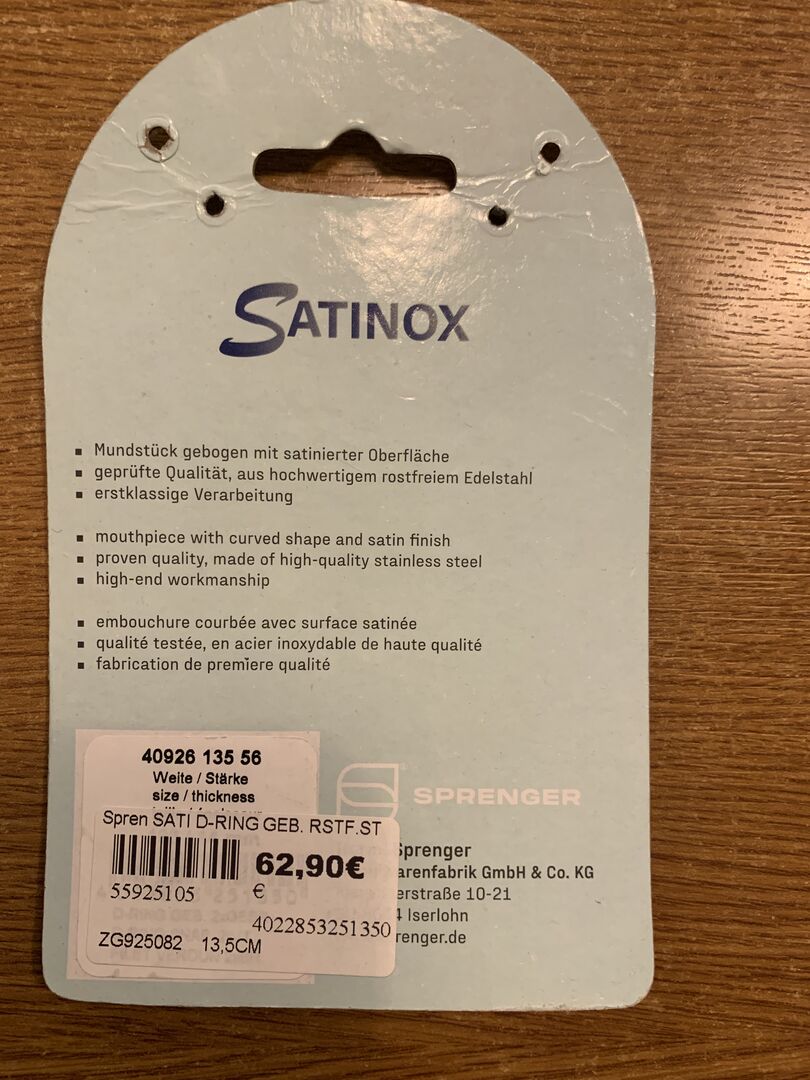 Your opinion on the product 'Sprenger Satinox D Ring Gebiss' counts! Help others make their decision – share what you liked (or didn't)!