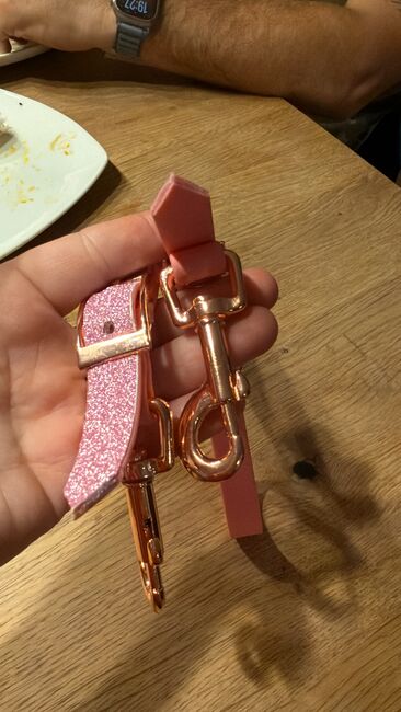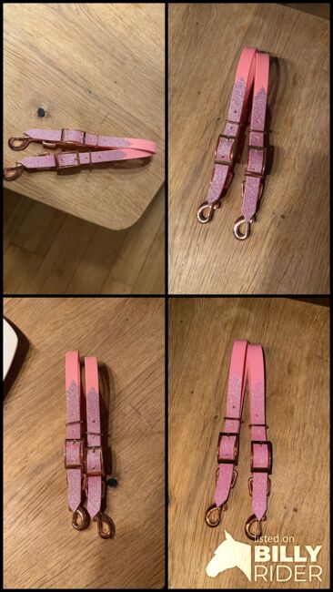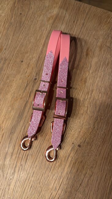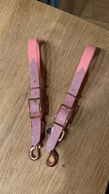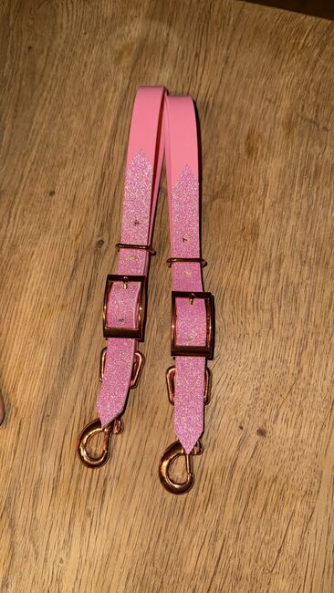 Bithanger wykonany z biothanne WB różowy i brokatowy na cavesson / uzdy - Sprzedam nowe, nigdy nie używane bithangery, które mogą być używane do cavessona lub snaffle.