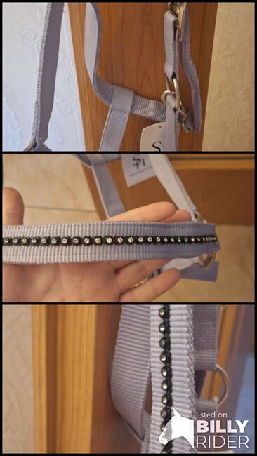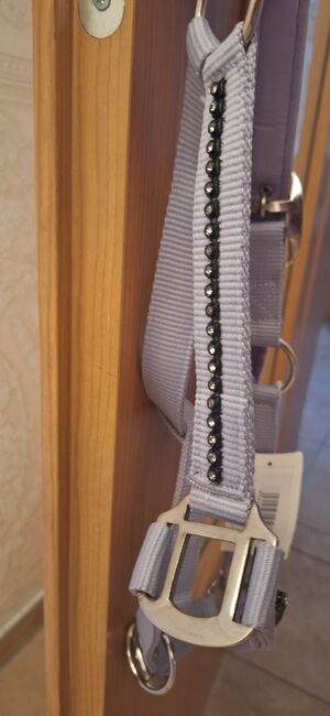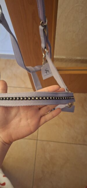 Błyszczący halter Showmaster - Sprzedam nowy halter w rozmiarze COB. Jest nieużywana i nadal ma metkę. Kolor: delikatny liliowy/fioletowy Z błyszczącymi cyrkoniami na nosku i policzkach - przyciąga wzrok ✨ Regulacja w okolicy szyi. Solidne okucia w kolorze srebrnym. Idealny do stajni lub na zawody - super elegancki, a jednocześnie odpowiedni do codziennego użytku.