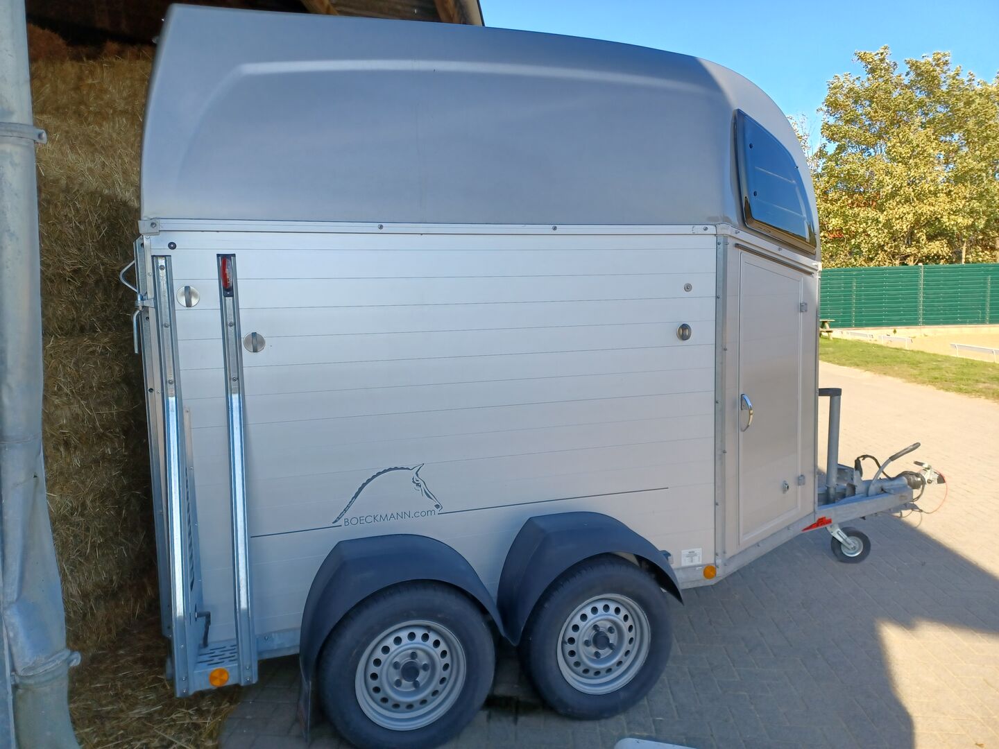 Böckmann Champion C przyczepa do przewozu koni - Sprzedam tę pełną przyczepę polową dla 2 koni firmy Böckmann. Pierwsza rejestracja 2016 r. TÜV do sierpnia 2023 r. 2. ręka ZGG 2T. Przednie i tylne pręty z regulacją wysokości. Ochrona przed uderzeniami/ochrona przed stopniami na ścianach bocznych Gumowa powłoka na tylnej klapie z wbudowanymi drążkami na stopnie Podnośnik plandeki Przezroczysta ściana działowa z PCV