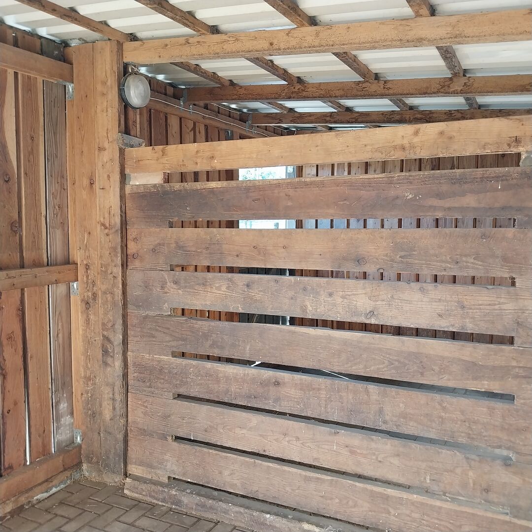 Pomiędzy dwuczęściową chatą pastwiskową a podwójnym boksem z przedłużeniem na zdjęciach znajduje się dodatkowe pomieszczenie, które zbudowaliśmy tylko na tylnej ścianie z tych samych desek modrzewiowych i blach trapezowych, ściany zewnętrzne zostały wykonane z wyżej wymienionych chat.