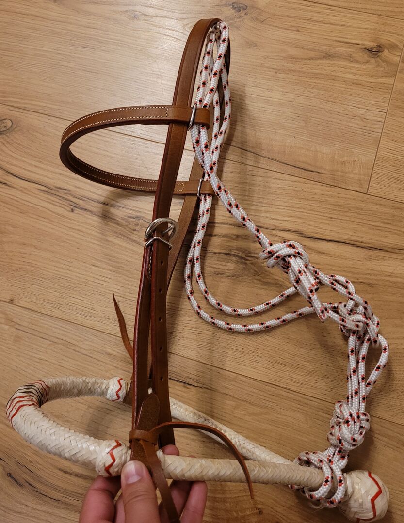 Bosal Bitless Snaffle - Sprzedaję bosal. W zestawie znajduje się reinstalacja tkaniny. Został zakupiony jakiś czas temu, ale nigdy nie był używany. Nakrycie głowy posiada możliwość regulacji rozmiaru. Został kupiony dla klaczy rasy Appaloosa.