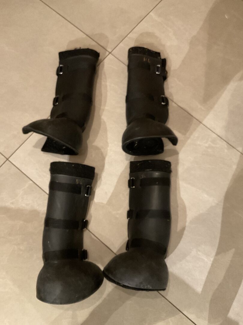 BR Hard Shell Transport Gaiters zestaw 4 szt. - Oferuje tutaj zestaw 4 butów transportowych firmy B R . Doskonale chronią konia podczas załadunku i rozładunku dzięki odpornemu na uderzenia tworzywu. Wewnątrz buty wyłożone są polarem. Getry wykazują normalne ślady zużycia. Na zewnątrz napisałam sharpiem, która to noga konia. Tylko słabo czytelny. Ale jest to praktyczne
