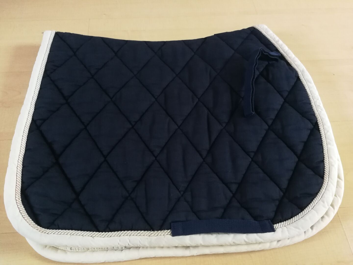 BR Saddle Pad ciemnoniebieski VS - Bardzo dobrze zachowana podkładka pod siodło VS firmy BR w kolorze ciemnoniebieskim z białą obwódką i jasnym ozdobnym sznurkiem.