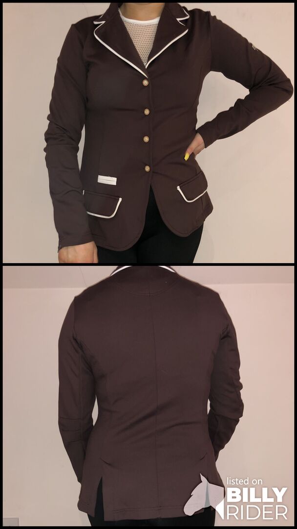 Brown with white piping Spooks show jacket. Very flattering on and very comfortable to wear. Has been used but still has plenty of life left in it. Size on label is medium.