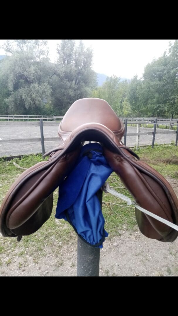 brązowe siodło skokowe Avalon JH w bardzo dobrym stanie - piękne siodło skokowe firmy JH w doskonałym stanie. Cena pierwotna € 3,600 Szerokość komory ok. 32-33