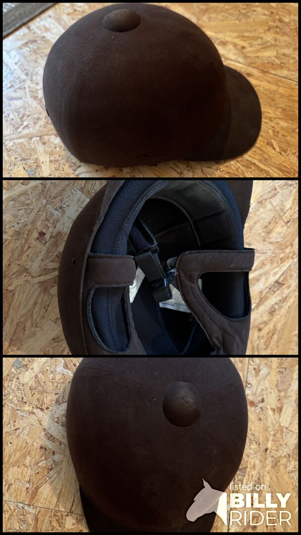 Brązowy aksamitny kask jeździecki - Kask ma kilka śladów zużycia, ale nigdy nie brał udziału w wypadku. Osłona jest lekko uszkodzona z przodu po prawej stronie (materiał łatwo się zdejmuje).